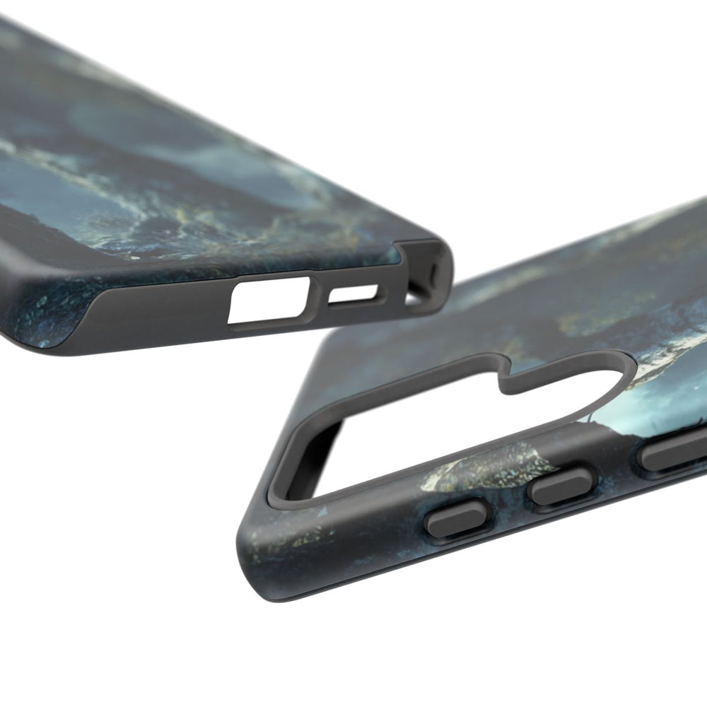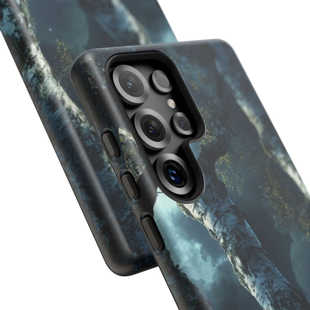 Dit telefoonhoesje toont een duister en sfeervol boslandschap met drie grote berkenbomen die duidelijk op de voorgrond staan. De bomen hebben een dikke, getextureerde schors met hier en daar mos. Op de achtergrond is een bewolkte nachtelijke hemel te zien, zacht verlicht door een mysterieuze gloed, wat zorgt voor een bijzondere en geheimzinnige sfeer. De bodem is bedekt met gras en kleine planten, wat het gevoel van ongerepte natuur versterkt. Het hoesje is voorzien van een dubbele laag met een polycarbonaat buitenkant en een TPU binnenzijde, en ondersteunt draadloos opladen.