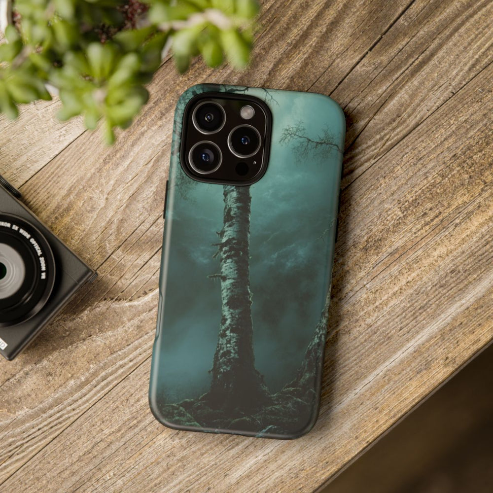 Dit hoesje is voorzien van een ontwerp met drie grote berkenbomen met dikke stammen in een donker, sfeervol bos. Een hemels licht breekt door de stormachtige, bewolkte lucht en zorgt voor een mysterieuze, gotische uitstraling. De bosgrond is bedekt met mos en stenen, wat extra textuur geeft aan het wilde landschap. Het hoesje heeft een dubbele laag van polycarbonaat en TPU, is mat afgewerkt, ondersteunt draadloos opladen en biedt bescherming tegen weersinvloeden.