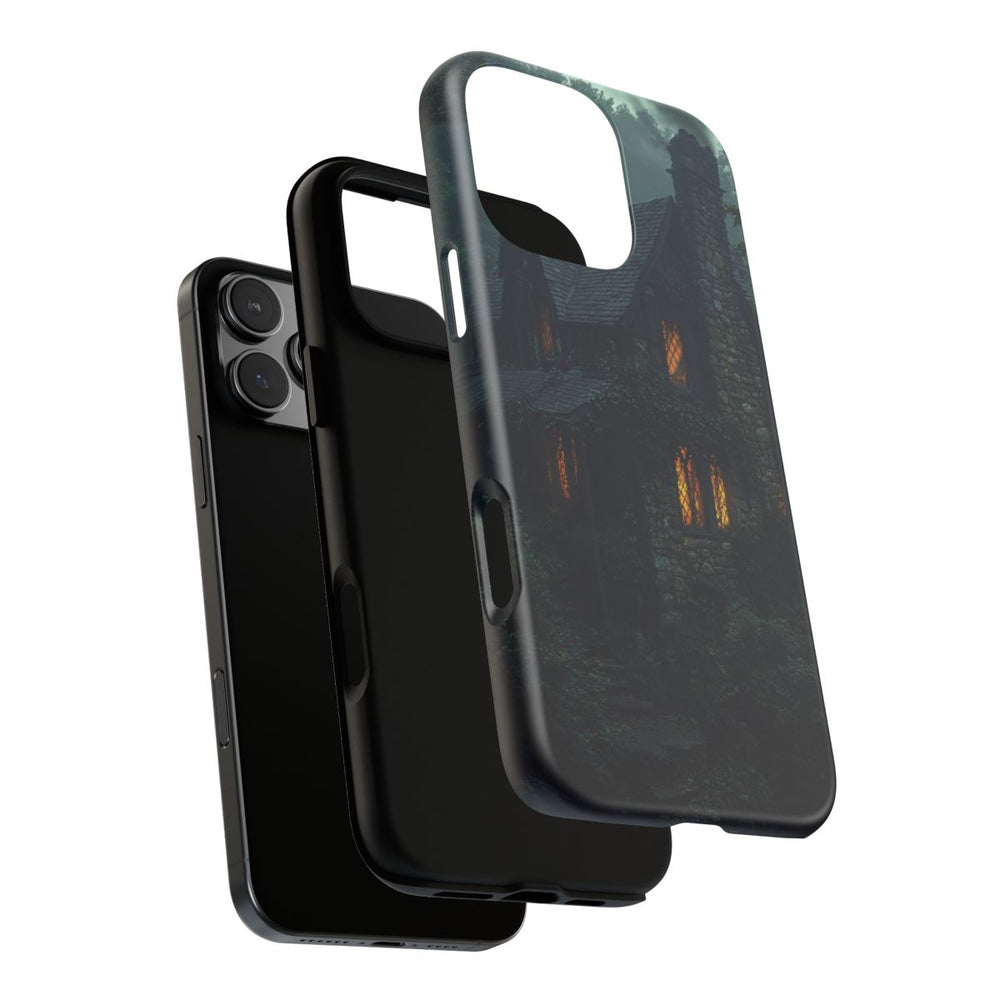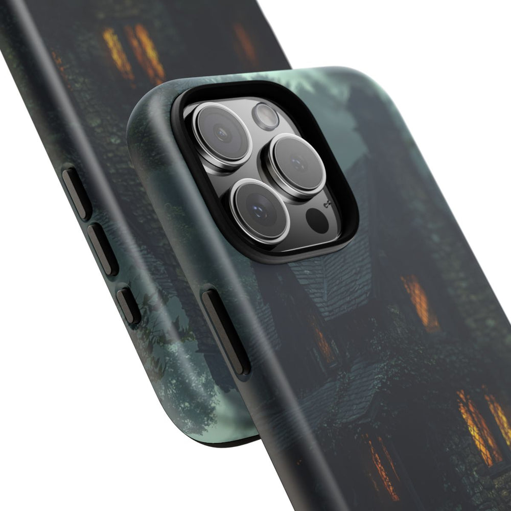 Dit ontwerp toont een gotisch stenen huisje verscholen in een dicht bos. Het huisje heeft een steil leien dak, een hoge stenen schoorsteen waar rook uit komt, en meerdere ramen die warm oplichten met oranje licht. Klimop en ander groen begroeien de muren, waardoor het huisje opgaat in de omliggende natuur. De sfeer is mysterieus en mistig, met gedempte groene en grijze tinten. Het hoesje heeft een dubbele beschermlaag, een matte afwerking en ondersteunt draadloos opladen.
