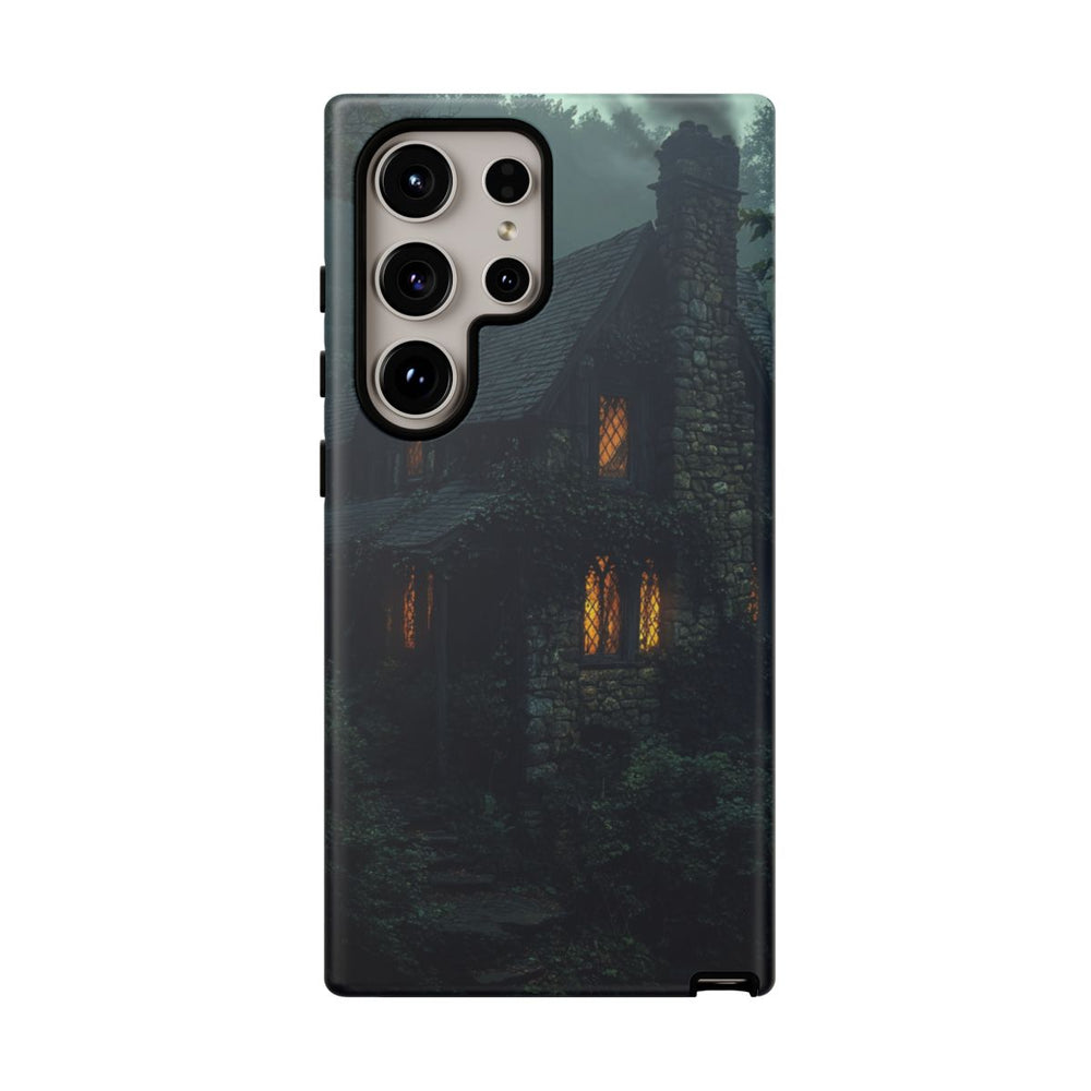 Dit telefoonhoesje toont een gotisch stenen huisje, omgeven door dicht, donkergroen bladerdek. Het huisje heeft een steil leistenen dak en een hoge schoorsteen waar rook uit opstijgt. Uit de ramen met ruitpatroon straalt warm oranje licht, wat mooi afsteekt tegen de koele, mistige sfeer van het bos. Het geheel oogt sfeervol en mysterieus, met een kronkelend stenen pad naar de voordeur. Het matte hoesje is extra stevig dankzij de dubbele laag met een polycarbonaat buitenkant en een TPU binnenzijde. Ontworpen voor optimale bescherming en geschikt voor draadloos opladen.