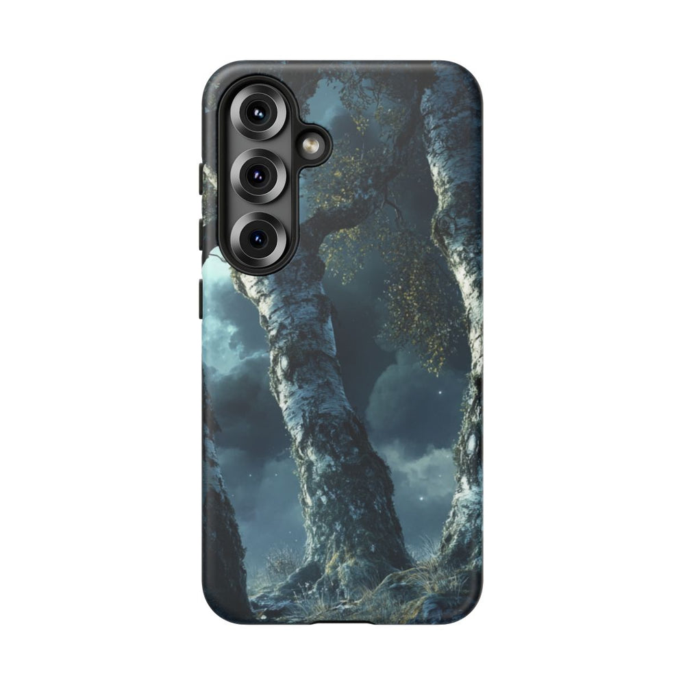 Dit ontwerp toont drie grote berkenbomen met dikke stammen die dicht bij elkaar staan in een donker, sfeervol bos. Een lichtbron achter de bomen zorgt voor een mystieke gloed op de schors en het omliggende bladerdek. Op de achtergrond is een bewolkte, stormachtige lucht zichtbaar met subtiele sterren. Het telefoonhoesje bestaat uit twee lagen: een stevige polycarbonaat buitenkant en een TPU binnenzijde. Het hoesje ondersteunt draadloos opladen en is bestand tegen verschillende weersomstandigheden.