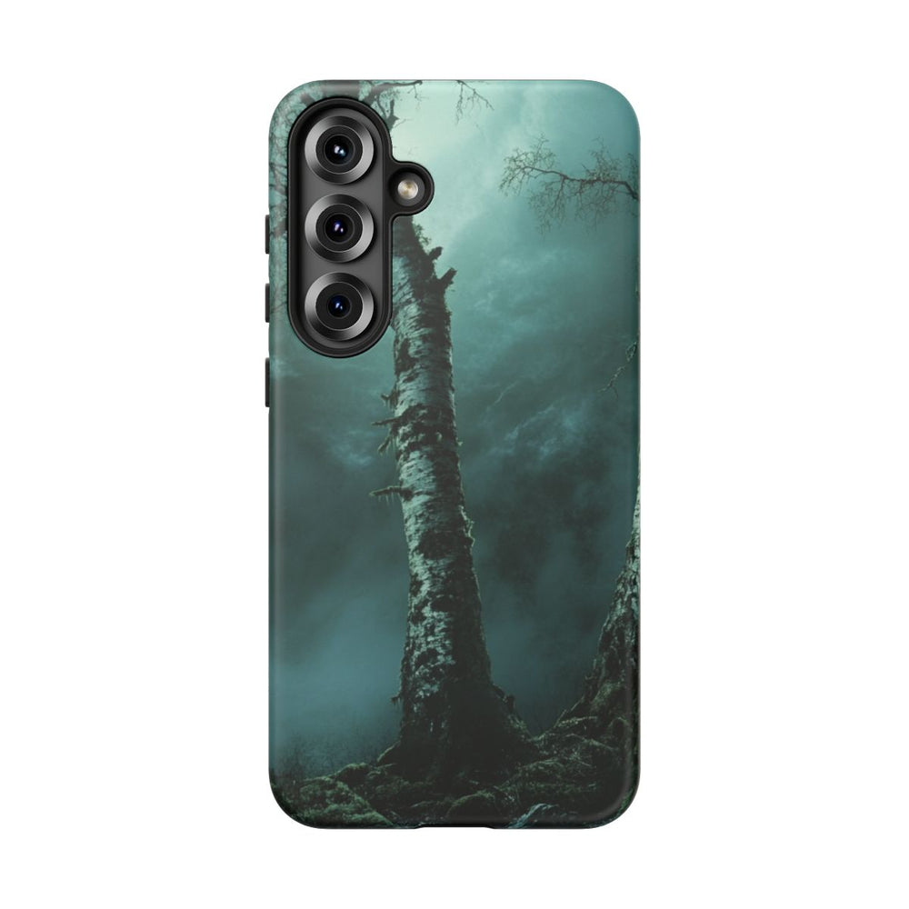 Dit hoesje toont drie hoge, oude berkenbomen met dikke stammen op een met mos begroeide bosgrond in een donker, mysterieus woud. Boven de bomen breekt een hemels licht door het bewolkte luchtruim, wat zorgt voor een geheimzinnige en gotische sfeer. Het hoesje heeft een dubbele laag met een stevige polycarbonaat buitenkant en een TPU-binnenkant voor extra stevigheid en bescherming. Geschikt voor draadloos opladen. Niet geschikt voor MagSafe.