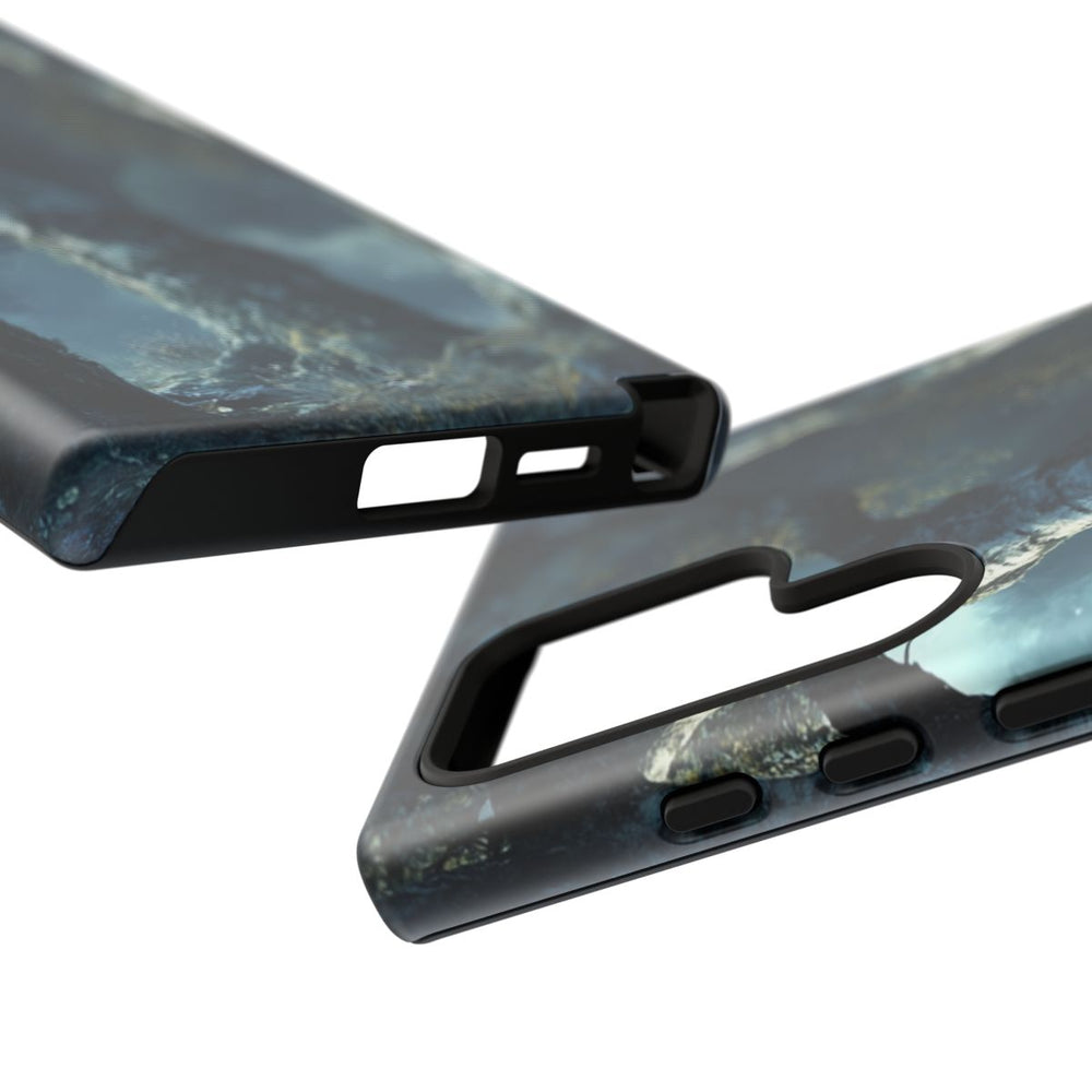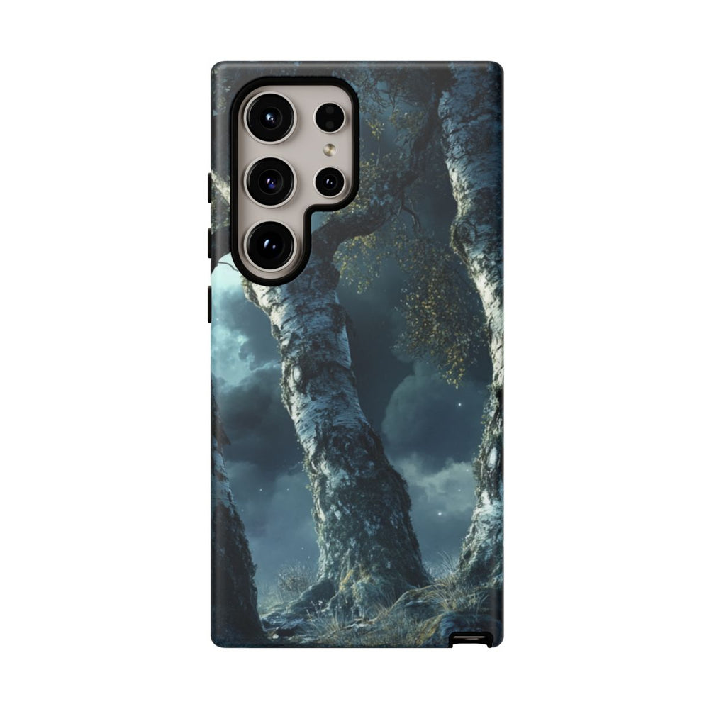 Dit ontwerp toont drie grote, oude berkenbomen met dikke stammen tegen een donkere, bewolkte nachtelijke hemel. De scène ademt een mystieke, gotische sfeer, waarbij zwak hemellicht de bomen en de omliggende wildernis subtiel verlicht. Het hoesje bestaat uit twee lagen met een matte afwerking: een stevige polycarbonaat buitenkant en een TPU-binnenzijde voor extra bescherming. Ondersteunt draadloos opladen.