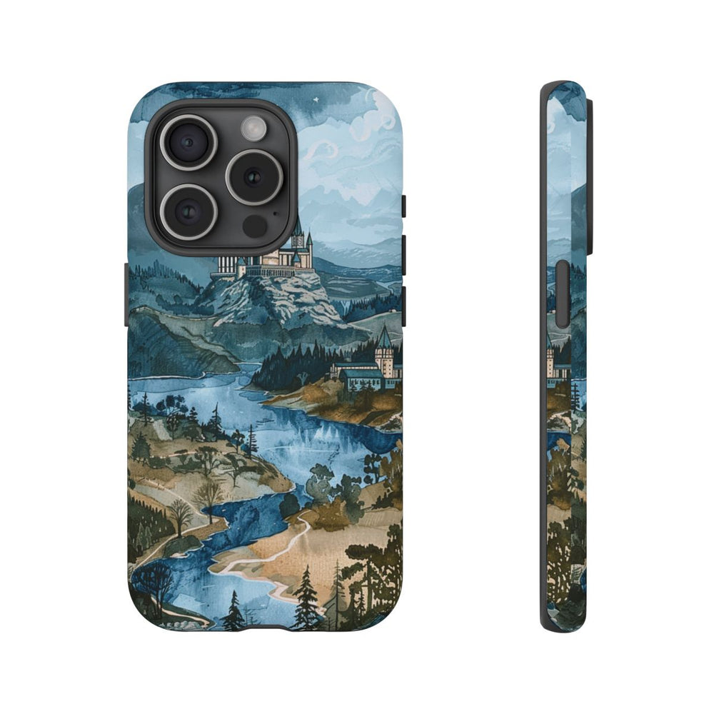 Dit telefoonhoesje is voorzien van een prachtige gouache-illustratie van een kasteel in een schilderachtig landschap. Op de afbeelding prijkt een indrukwekkend kasteel op een rotsachtige heuvel, omringd door bergen en bomen. Op de voorgrond stroomt een rustige rivier, waarin de blauwe tinten van lucht en water weerspiegeld worden. Het kleurenpalet bestaat uit diverse blauwen en groenen, wat zorgt voor een kalme en sfeervolle uitstraling. Het hoesje is ontworpen voor optimale bescherming en duurzaamheid, met een stevige dubbele laag die bestand is tegen dagelijks gebruik.