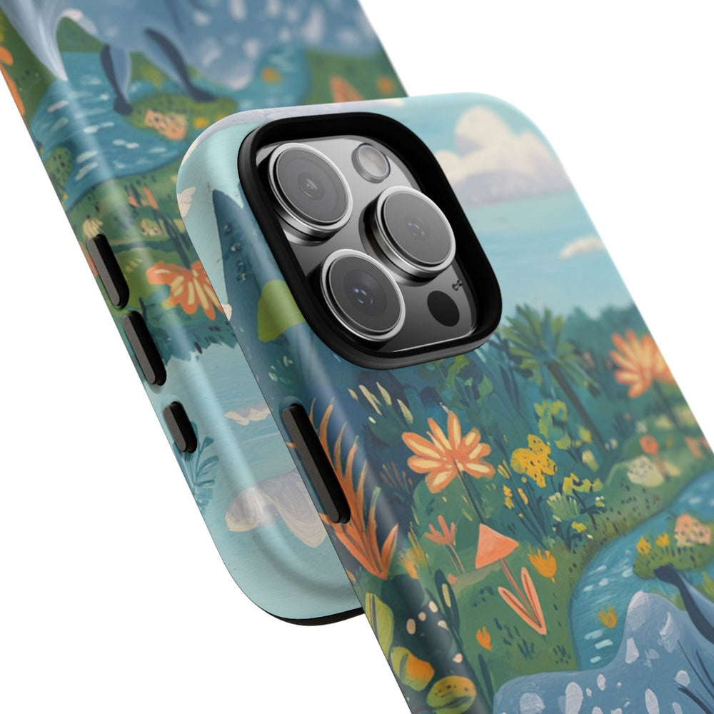 Dit hoesje is voorzien van een illustratie in gouache stijl van een neushoorn die op een lichtroze ondergrond staat, omringd door weelderig groen blad en kleurrijke bloemen. Op de achtergrond zie je een klein blauw meertje met stenen en planten, met daarachter een lucht met zachte witte wolken en verre bergen. Het ontwerp maakt gebruik van rustgevende blauwtinten en groenen, met accenten van oranje en geel. Het hoesje heeft een dubbele laag, een matte afwerking en is gemaakt van polycarbonaat en TPU. Geschikt voor draadloos opladen.