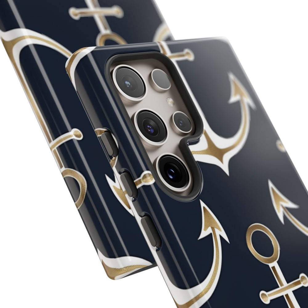 Dit hoesje heeft een stijlvol patroon van goudkleurige ankers die gelijkmatig verdeeld zijn over een diepe donkerblauwe achtergrond. Elke anker is afgezet met een witte omlijning, wat zorgt voor een helder contrast tegen het donkere geheel. Het patroon herhaalt zich gelijkmatig en straalt een klassieke, maritieme sfeer uit. Het hoesje is glanzend afgewerkt en bestaat uit twee lagen: een stevige polycarbonaat buitenkant en een TPU-binnenzijde voor extra bescherming en duurzaamheid. Het hoesje ondersteunt draadloos opladen en is bestand tegen invloeden van buitenaf.