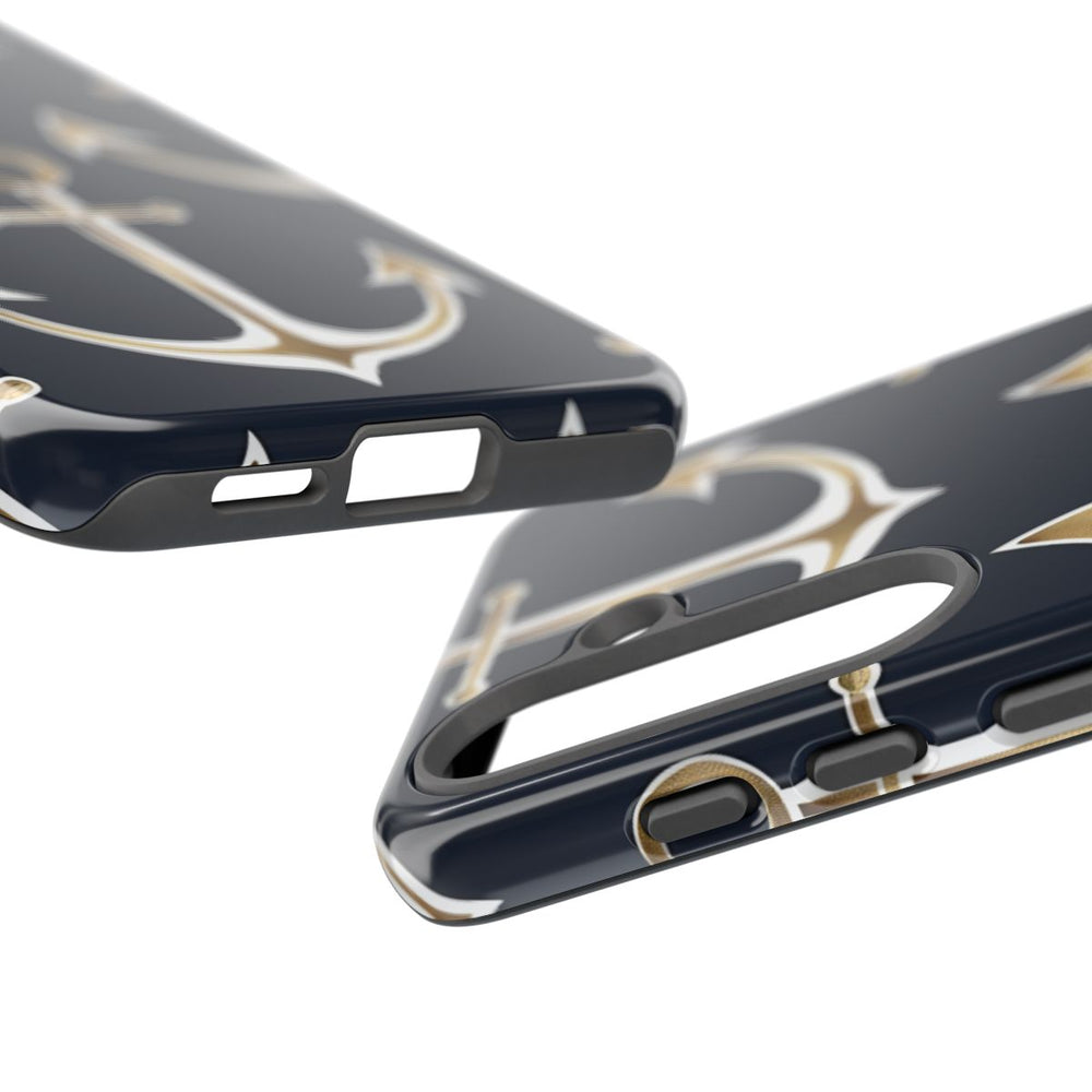 Dit hoesje heeft een stijlvol patroon van goudkleurige ankers die gelijkmatig verdeeld zijn over een diepe donkerblauwe achtergrond. Elke anker is afgezet met een witte omlijning, wat zorgt voor een helder contrast tegen het donkere geheel. Het patroon herhaalt zich gelijkmatig en straalt een klassieke, maritieme sfeer uit. Het hoesje is glanzend afgewerkt en bestaat uit twee lagen: een stevige polycarbonaat buitenkant en een TPU-binnenzijde voor extra bescherming en duurzaamheid. Het hoesje ondersteunt draadloos opladen en is bestand tegen invloeden van buitenaf.