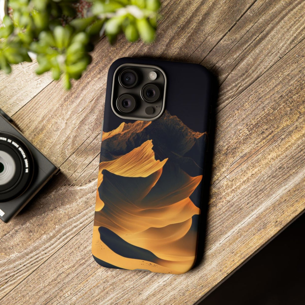 Dit telefoonhoesje is voorzien van een opvallend berglandschap met goudkleurige verlooptonen. De bergen hebben een getextureerd uiterlijk, waarbij donkere en zwarte schaduwen de toppen en hellingen accentueren. De diepe zwarte achtergrond zorgt voor een krachtig contrast, waardoor de warme gouden tinten van de bergen extra opvallen. De afbeelding is gedrukt op een mat hoesje van polycarbonaat en TPU, dat extra stevig is en optimale bescherming biedt. Geschikt voor draadloos opladen.