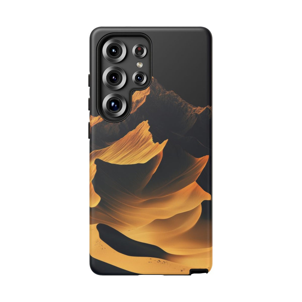 Dit hoesje heeft een opvallend berglandschap met gouden kleurverlopen. De bergen zijn voorzien van scherpe richels en vloeiende vormen, waarbij donkere schaduwen zorgen voor diepte en contrast. De effen donkere achtergrond laat de gouden tinten van de bergtoppen en hellingen extra opvallen. Het hoesje bestaat uit twee lagen van polycarbonaat en TPU voor extra stevigheid en bescherming, en ondersteunt draadloos opladen.