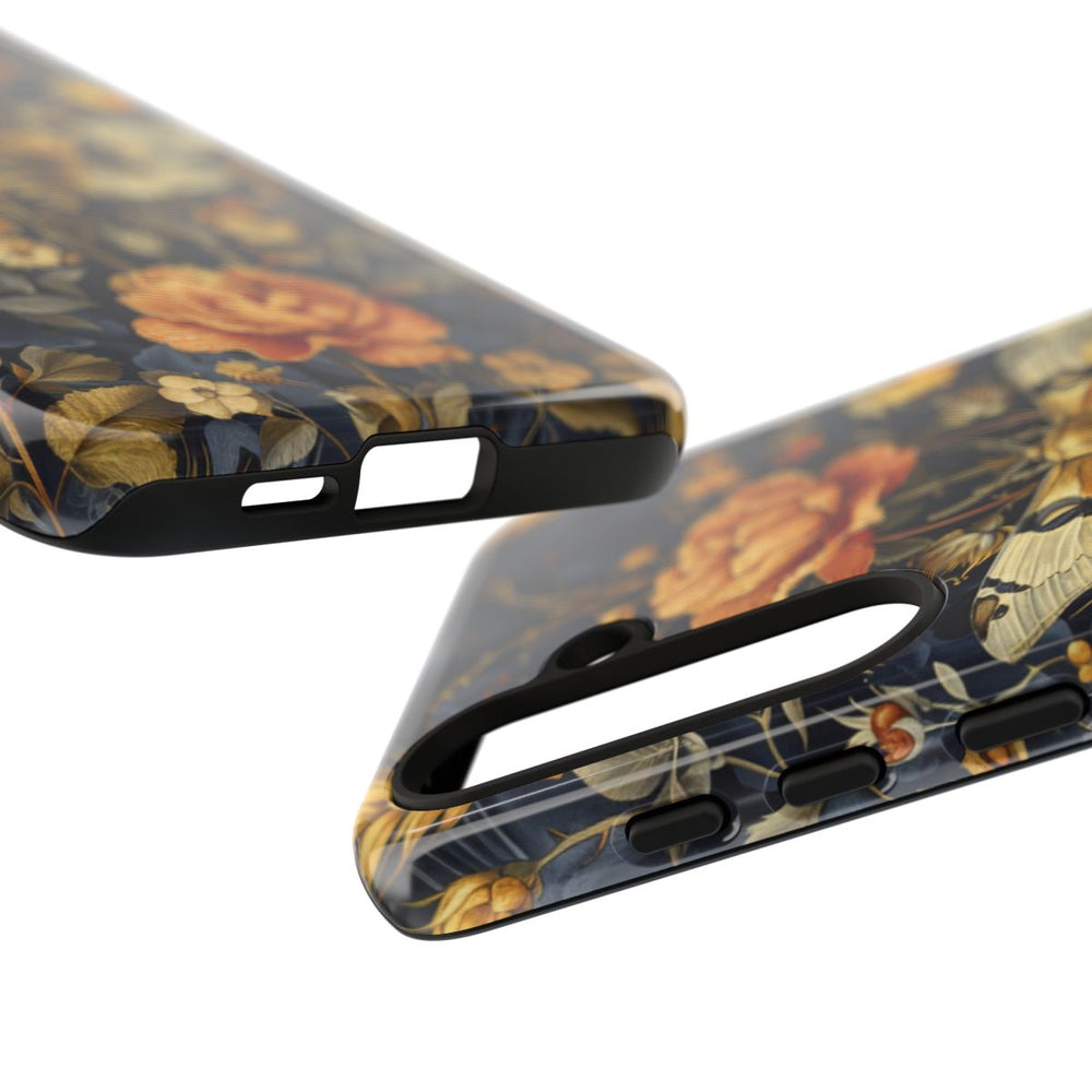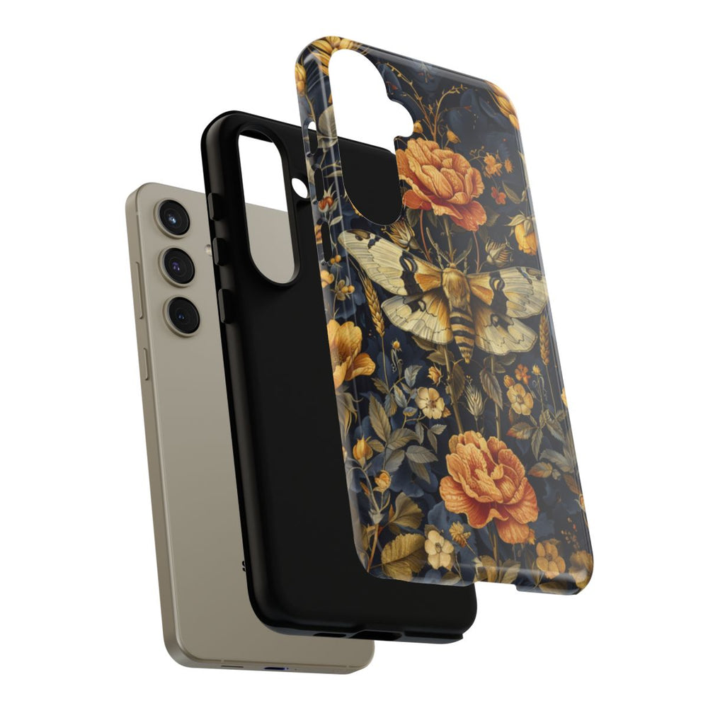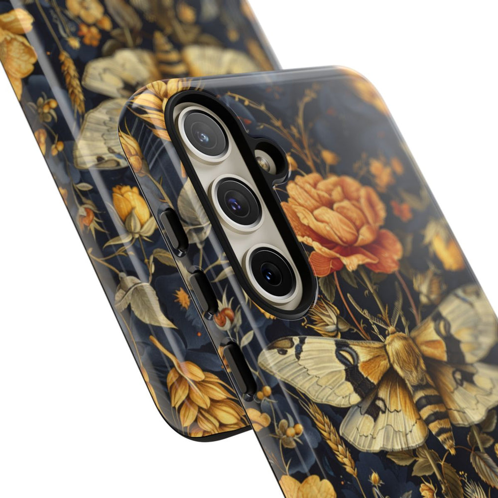 Dit telefoonhoesje heeft een verfijnd patroon van gouden bloemen, aren en bladeren op een diep donkerblauwe achtergrond. In het midden prijkt een grote mot met gedetailleerde vleugelpatronen tussen de florale elementen. De illustratie combineert warme goudtinten met gedempte groenen, wat zorgt voor een opvallend contrast met de donkere basis. Het symmetrische en rijk uitgewerkte ontwerp past perfect bij een glanzend en stevig hoesje van polycarbonaat en TPU, dat optimale bescherming en duurzaamheid biedt.
