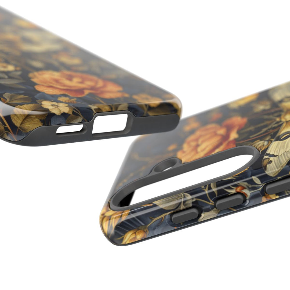 Dit telefoonhoesje heeft een verfijnd patroon van gouden bloemen, aren en bladeren op een diep donkerblauwe achtergrond. In het midden prijkt een grote mot met gedetailleerde vleugelpatronen tussen de florale elementen. De illustratie combineert warme goudtinten met gedempte groenen, wat zorgt voor een opvallend contrast met de donkere basis. Het symmetrische en rijk uitgewerkte ontwerp past perfect bij een glanzend en stevig hoesje van polycarbonaat en TPU, dat optimale bescherming en duurzaamheid biedt.