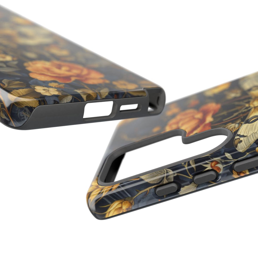 Dit telefoonhoesje heeft een verfijnd patroon van gouden bloemen, aren en bladeren op een diep donkerblauwe achtergrond. In het midden prijkt een grote mot met gedetailleerde vleugelpatronen tussen de florale elementen. De illustratie combineert warme goudtinten met gedempte groenen, wat zorgt voor een opvallend contrast met de donkere basis. Het symmetrische en rijk uitgewerkte ontwerp past perfect bij een glanzend en stevig hoesje van polycarbonaat en TPU, dat optimale bescherming en duurzaamheid biedt.