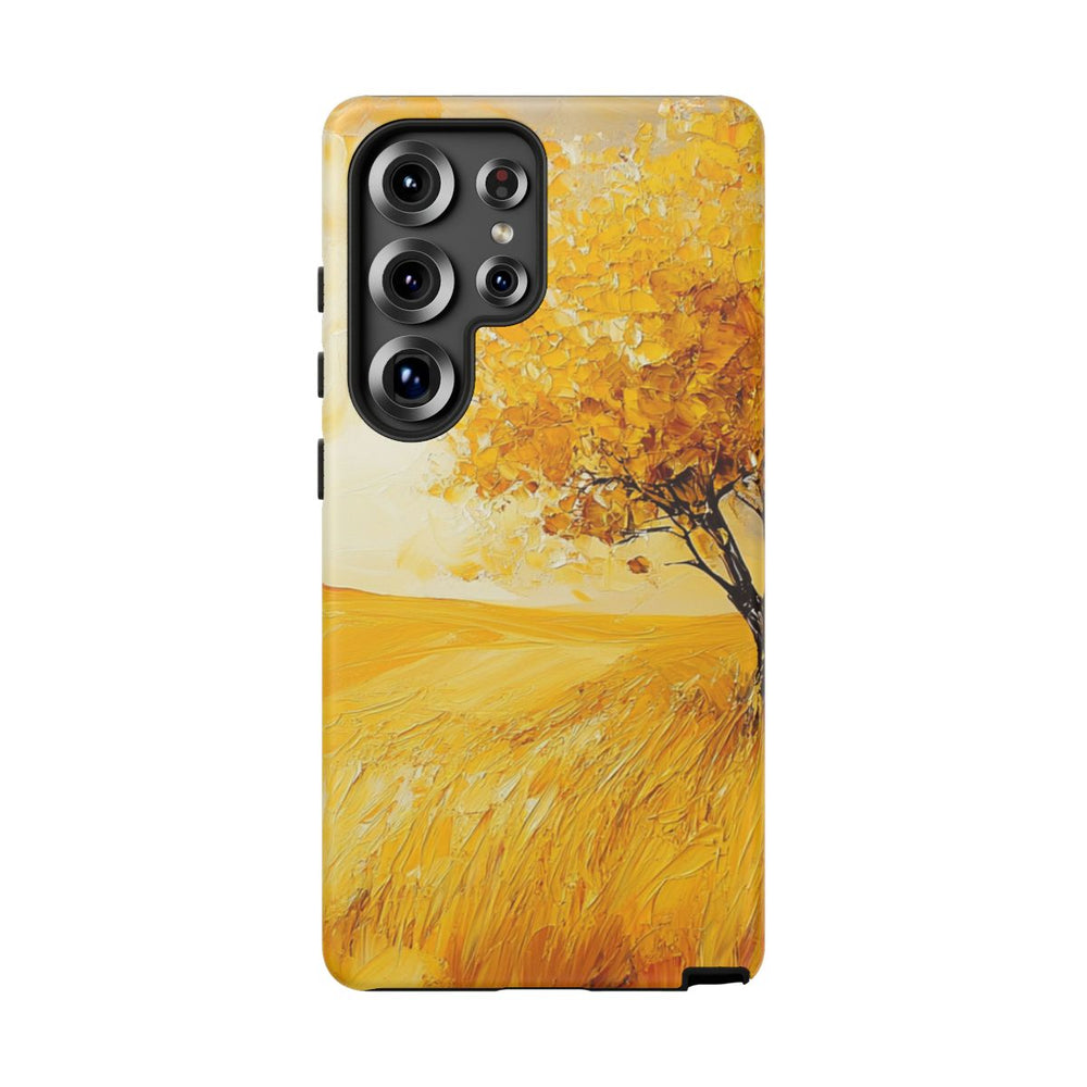Dit ontwerp toont een schildering met grove penseelstreken van een enkele boom met goudgele bladeren in een veld met hoog, goudkleurig gras. De achtergrond bestaat uit zachte, golvende streken in lichtgeel en crèmekleur, wat zorgt voor een warme en zonnige uitstraling. Het hoesje is een stevige, matte variant met dubbele laag van polycarbonaat en TPU voor extra bescherming en is geschikt voor draadloos opladen.