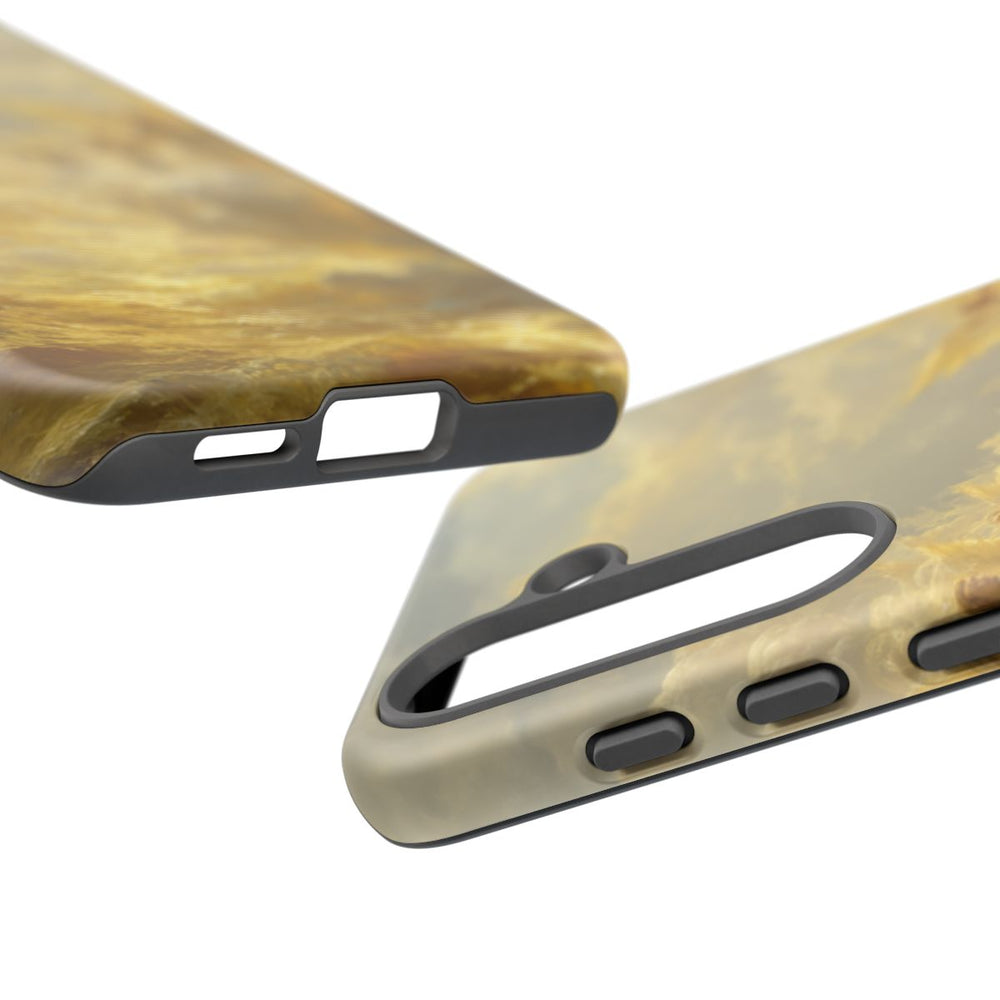 Dit hoesje toont talloze engelen met stralende gouden vleugels en golvende gewaden, die oprijzen uit zachte, pluizige wolken en daarin zijn omgeven. Onder hen schittert een gouden zee die het licht weerkaatst en zo een heldere, bijna magische sfeer creëert. De scène is gehuld in warme goudtinten, met gedetailleerde wolken en een heldere lucht. Het hoesje bestaat uit twee lagen: een stevige polycarbonaat buitenkant en een TPU-binnenzijde. Geschikt voor draadloos opladen.
