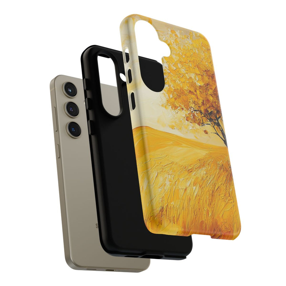 Dit hoesje is voorzien van een schilderachtig ontwerp met een enkele boom met goudgele bladeren op een zacht glooiende heuvel, bedekt met hoog, goudkleurig gras. De achtergrond toont een subtiel vervaagde lucht in lichte crème- en geeltinten, wat zorgt voor een warme en zonnige uitstraling. Het matte hoesje bestaat uit twee lagen van polycarbonaat en TPU en biedt stevige bescherming. Geschikt voor draadloos opladen.