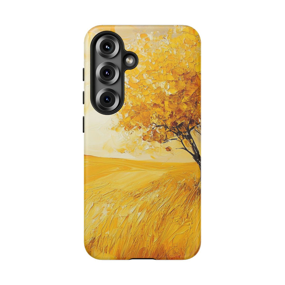 Dit ontwerp toont een levendig schilderij van een enkele boom met goudgele bladeren, staand op een zacht glooiende heuvel bedekt met hoog geel gras. De lucht is subtiel weergegeven met lichte crème- en gele penseelstreken, wat zorgt voor een warme, zonnige sfeer. De afbeelding is gedrukt op een matte, stevige hoes met dubbele laag van polycarbonaat en TPU. Deze hoes is ontworpen voor duurzaamheid en biedt uitstekende bescherming, ook buitenshuis. Geschikt voor de Galaxy S25.