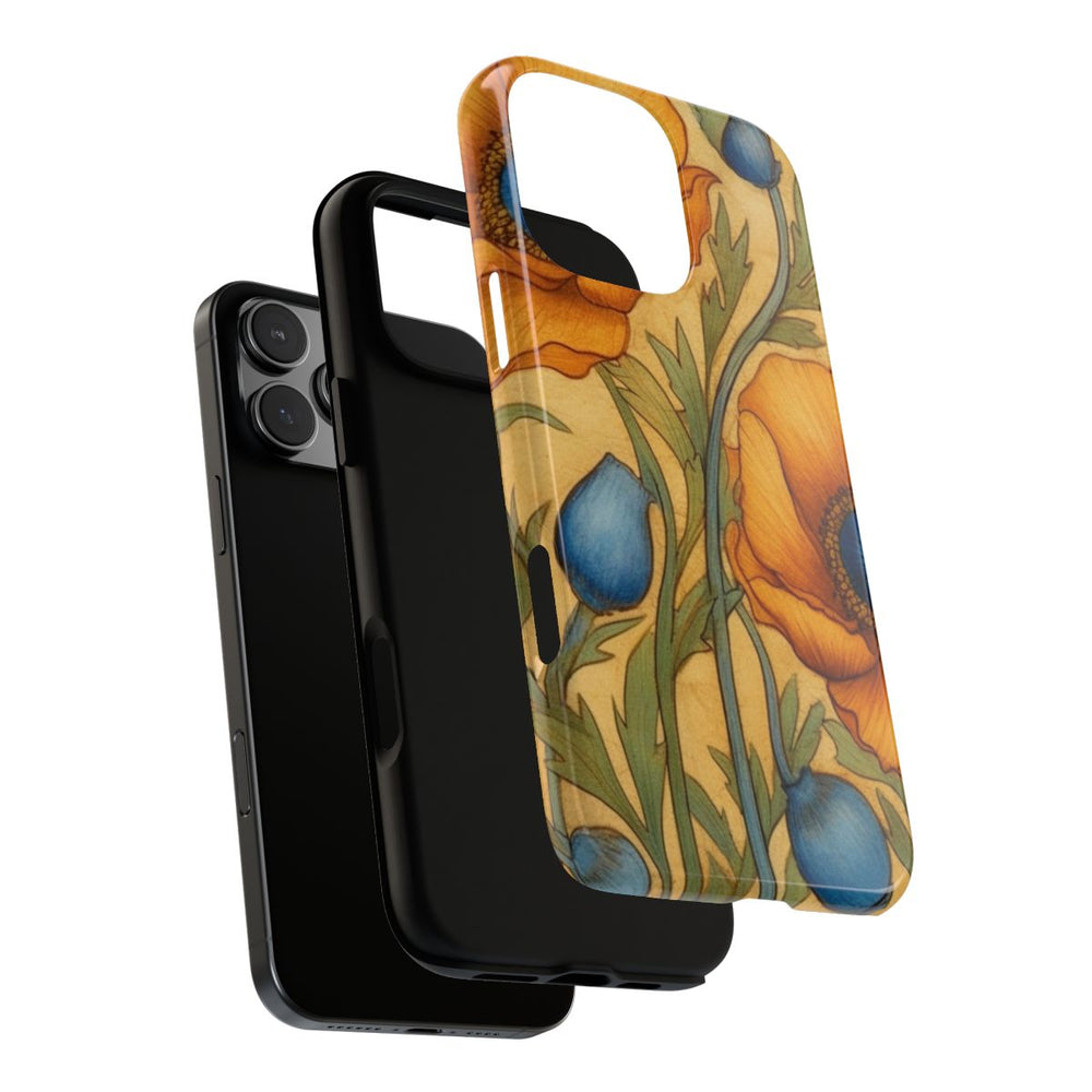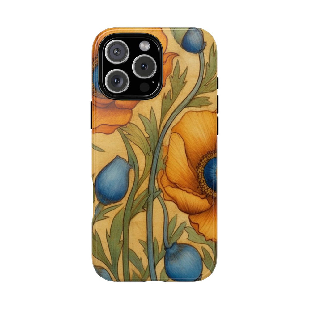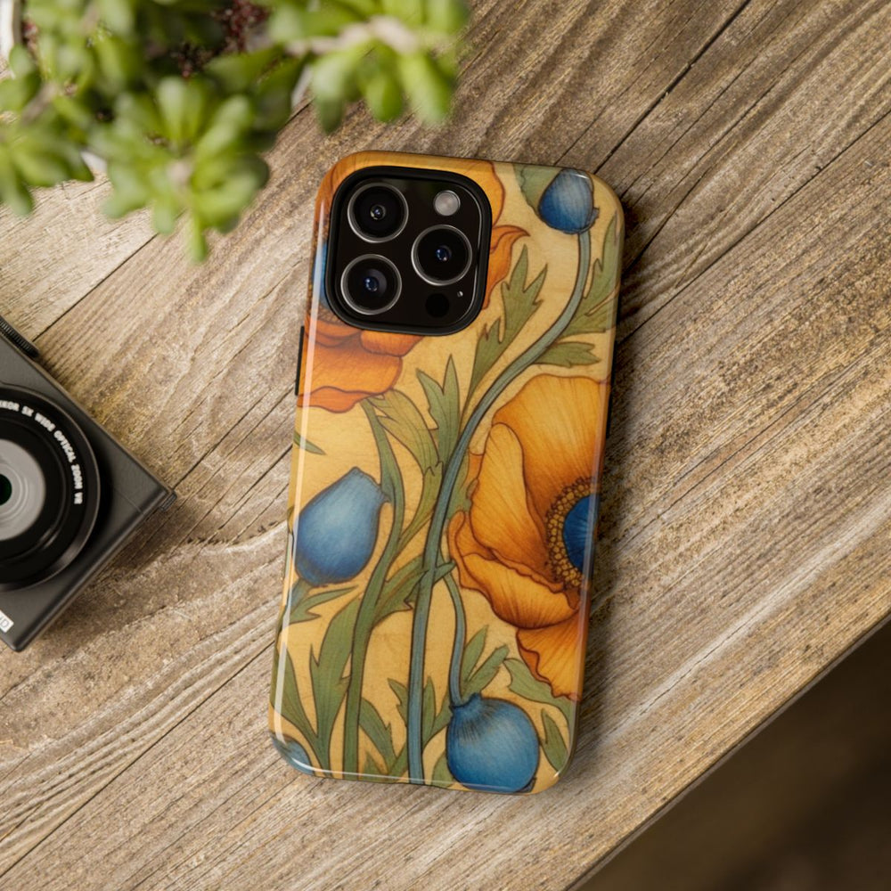 Dit telefoonhoesje is versierd met grote gouden klaprozen met opvallende blauwe harten, omringd door groene stelen en bladeren. De bloemen en knoppen zijn verfijnd getekend met fijne lijnen, wat zorgt voor een natuurlijke en artistieke uitstraling. De achtergrond heeft een warme beige tint die mooi aansluit bij de gouden bloemblaadjes. Het patroon is gedrukt op een glanzend en stevig hoesje van polycarbonaat en TPU, dat bestaat uit twee lagen voor extra bescherming en geschikt is voor draadloos opladen. Het hoesje is ontworpen voor duurzaamheid en bestand tegen gebruik buitenshuis.