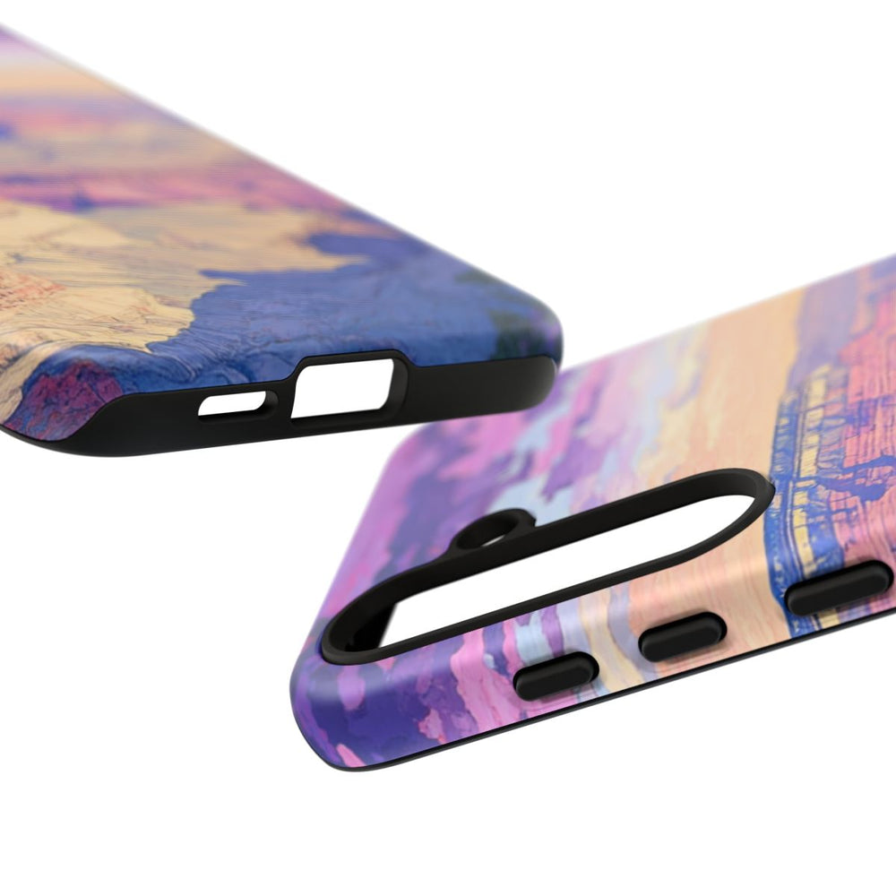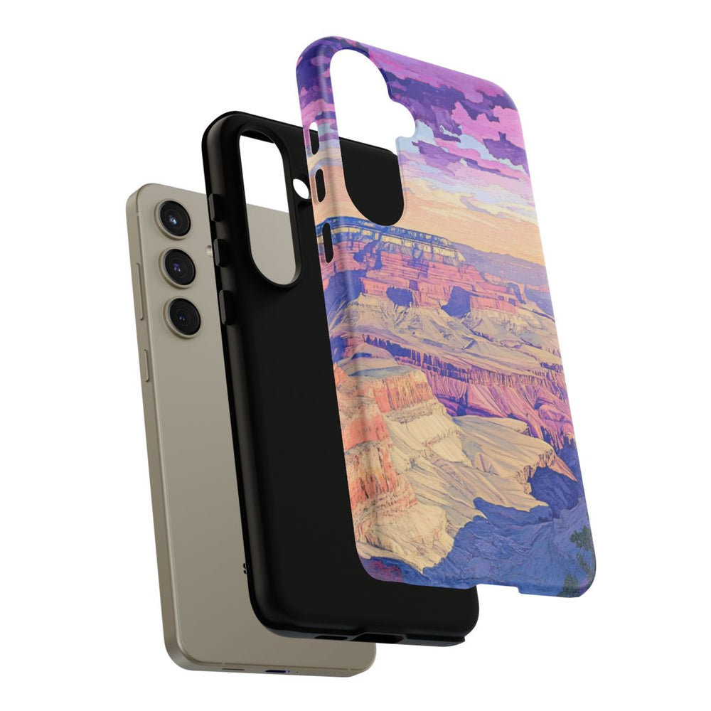 Dit telefoonhoesje heeft een levendig ontwerp met een prachtig uitzicht op de Grand Canyon. De indrukwekkende kliffen en gelaagde rotsformaties komen mooi naar voren onder een kleurrijke lucht, met tinten paars, roze en warme kleuren die samen een betoverend geheel vormen. Het hoesje heeft een stevige dubbele laag voor extra bescherming en ondersteunt draadloos opladen. Zo combineert het stijl en gebruiksgemak voor dagelijks gebruik.