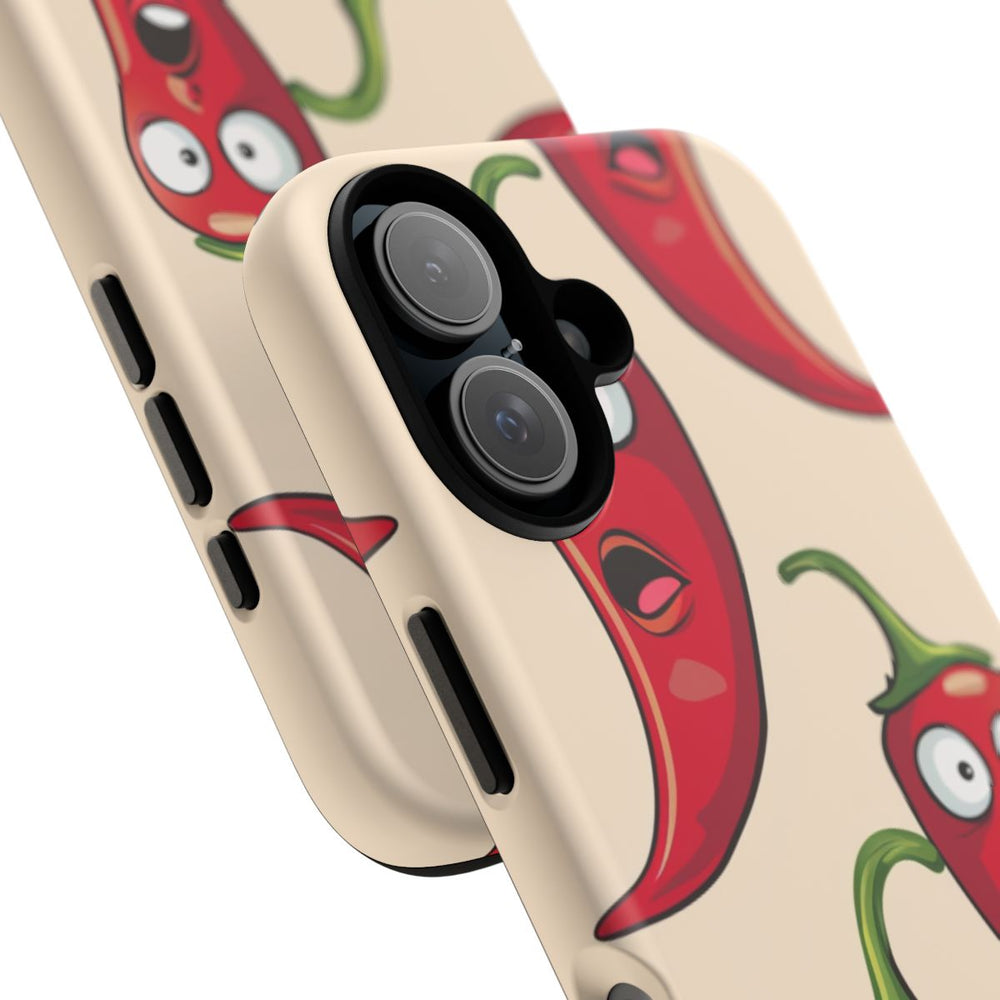 Dit hoesje heeft een vrolijk patroon van rode chilipepers met expressieve, getekende gezichten die verschillende emoties tonen. Elke chilipeper heeft grote, ronde ogen en een groene steel, afgebeeld op een licht beige achtergrond. Het speelse en levendige ontwerp maakt dit hoesje tot een echte blikvanger. Dankzij de stevige polycarbonaat buitenkant en TPU-binnenzijde biedt het hoesje extra bescherming. Geschikt voor draadloos opladen.