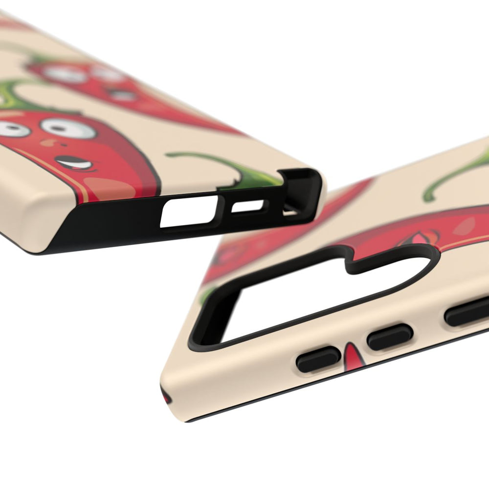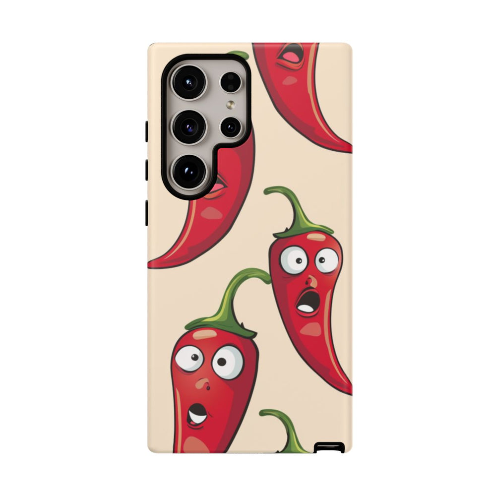 Dit hoesje heeft een vrolijk patroon van rode chilipepers met expressieve, getekende gezichten die verschillende emoties tonen. Elke chilipeper heeft grote, ronde ogen en een groene steel, afgebeeld op een licht beige achtergrond. Het speelse en levendige ontwerp maakt dit hoesje tot een echte blikvanger. Dankzij de stevige polycarbonaat buitenkant en TPU-binnenzijde biedt het hoesje extra bescherming. Geschikt voor draadloos opladen.