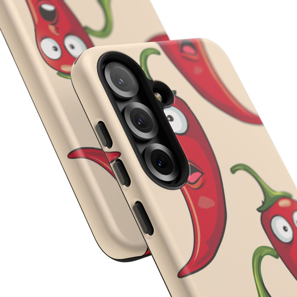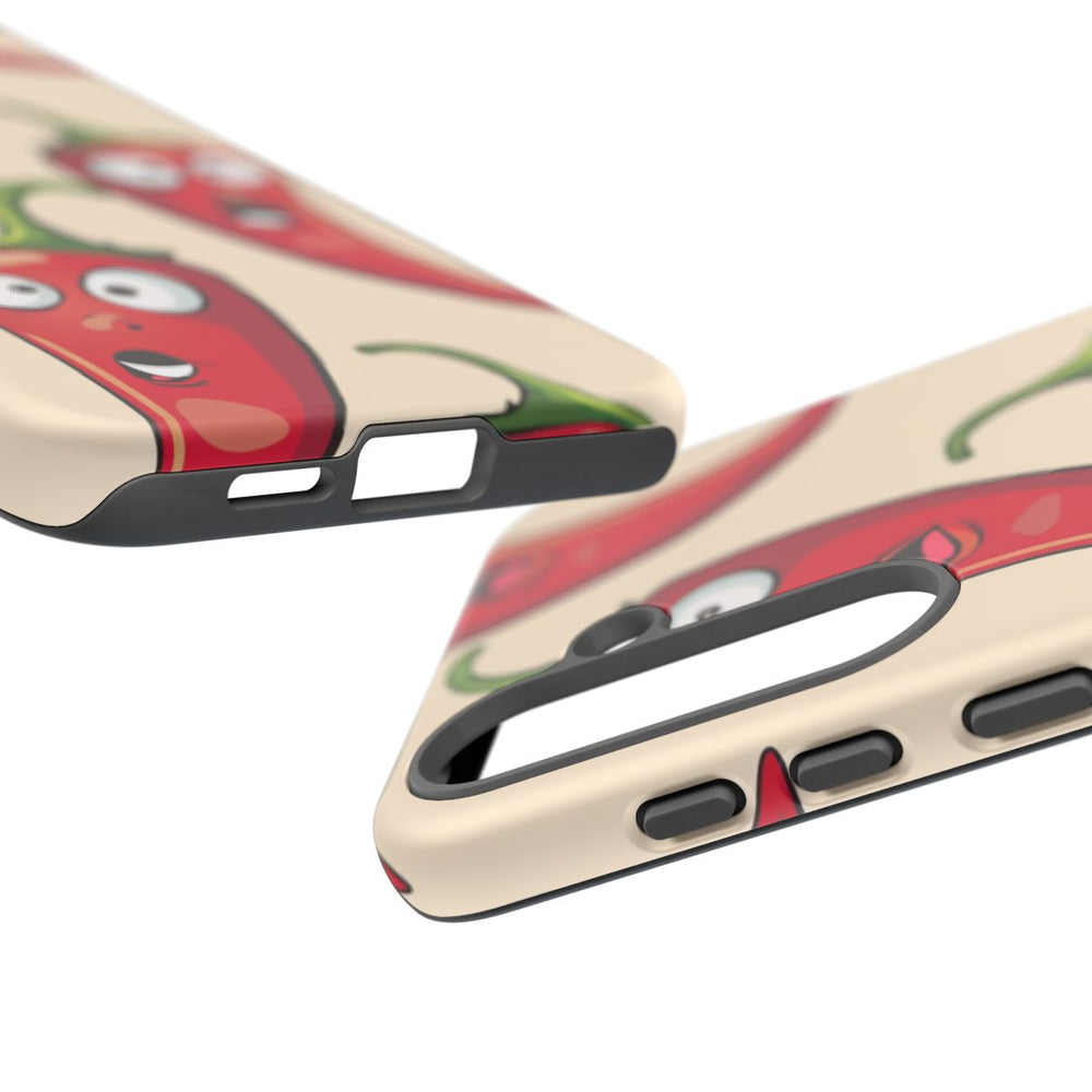 Dit hoesje heeft een vrolijk patroon van rode chilipepers met expressieve, getekende gezichten die verschillende emoties tonen. Elke chilipeper heeft grote, ronde ogen en een groene steel, afgebeeld op een licht beige achtergrond. Het speelse en levendige ontwerp maakt dit hoesje tot een echte blikvanger. Dankzij de stevige polycarbonaat buitenkant en TPU-binnenzijde biedt het hoesje extra bescherming. Geschikt voor draadloos opladen.