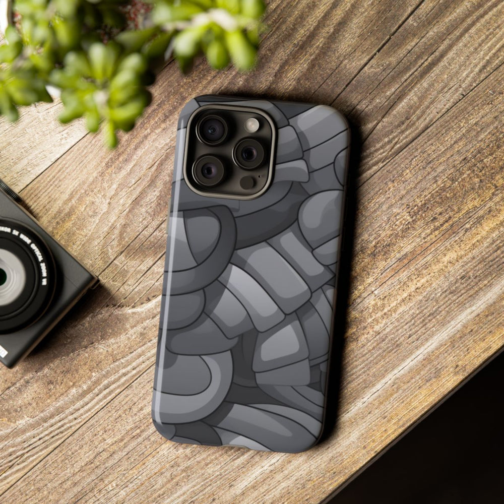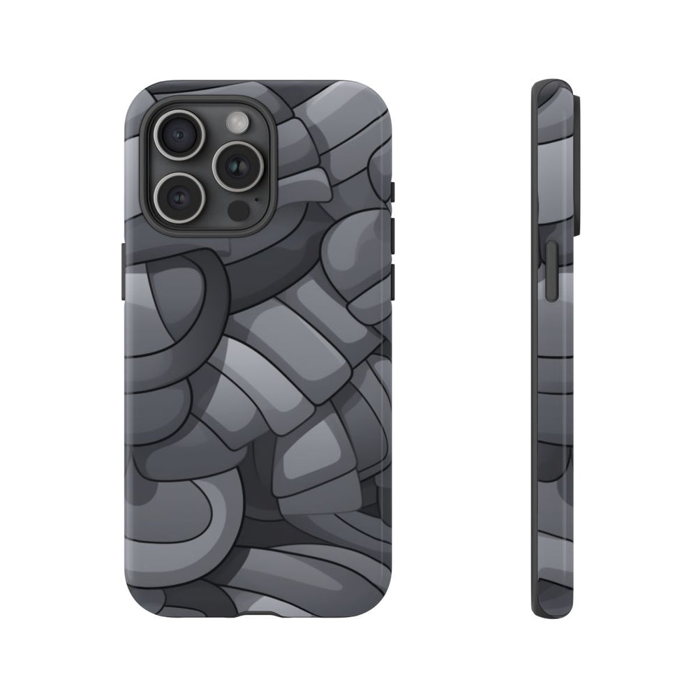 Dit hoesje is voorzien van een abstract patroon met verweven buisvormen in verschillende grijstinten. De vormen hebben gladde, afgeronde randen en een gestileerde, bijna cartoonachtige uitstraling met subtiele schaduweffecten voor extra diepte. Het ontwerp is minimalistisch en monochroom, waarbij textuur en vorm centraal staan zonder extra kleuren of details. Het glanzende, stevige hoesje heeft een dubbele laag voor extra bescherming en ondersteunt draadloos opladen.