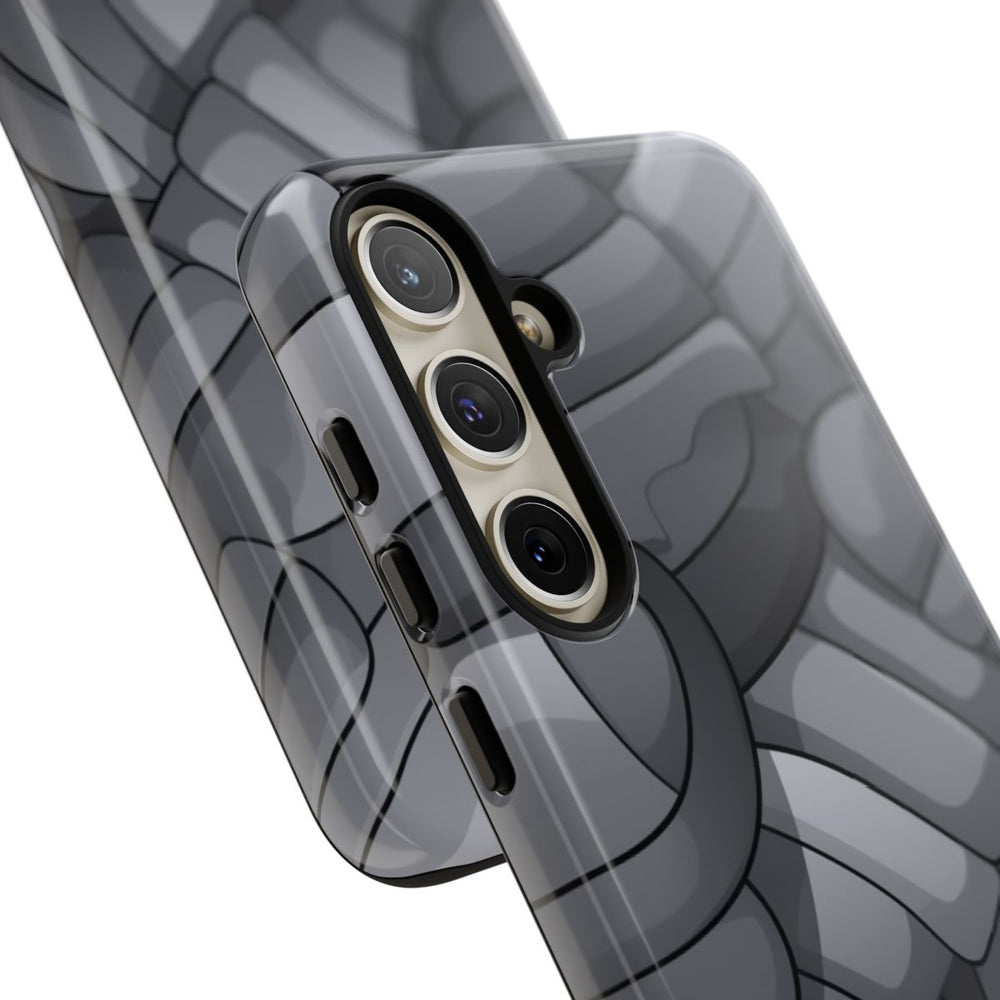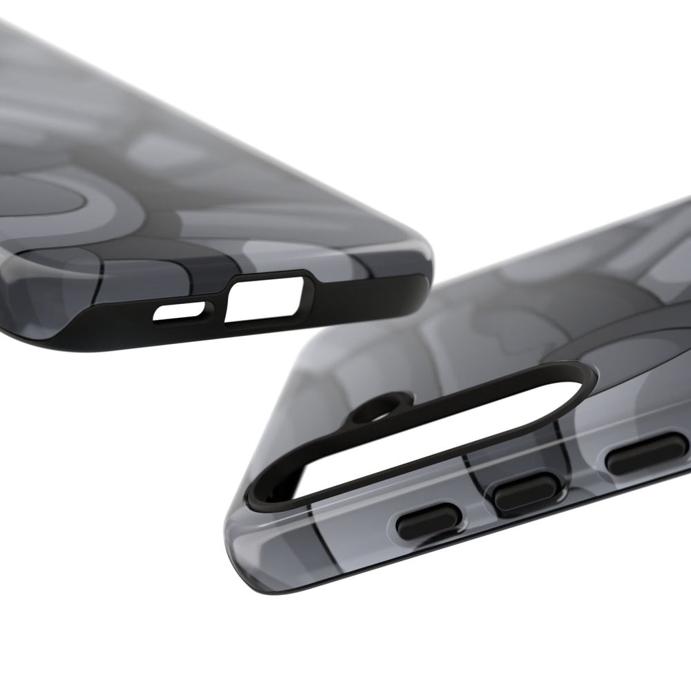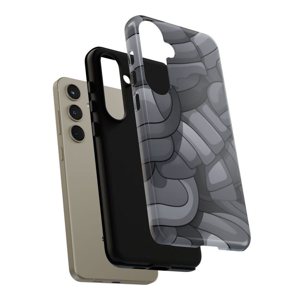 Dit hoesje is voorzien van een abstract patroon met verweven buisvormen in verschillende grijstinten. De vormen hebben gladde, afgeronde randen en een gestileerde, bijna cartoonachtige uitstraling met subtiele schaduweffecten voor extra diepte. Het ontwerp is minimalistisch en monochroom, waarbij textuur en vorm centraal staan zonder extra kleuren of details. Het glanzende, stevige hoesje heeft een dubbele laag voor extra bescherming en ondersteunt draadloos opladen.