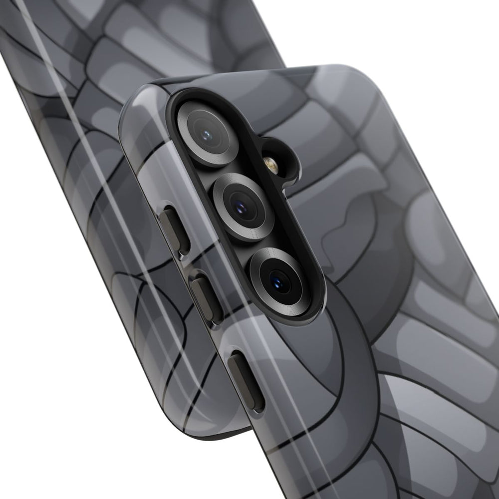 Dit hoesje is voorzien van een abstract patroon met verweven buisvormen in verschillende grijstinten. De vormen hebben gladde, afgeronde randen en een gestileerde, bijna cartoonachtige uitstraling met subtiele schaduweffecten voor extra diepte. Het ontwerp is minimalistisch en monochroom, waarbij textuur en vorm centraal staan zonder extra kleuren of details. Het glanzende, stevige hoesje heeft een dubbele laag voor extra bescherming en ondersteunt draadloos opladen.