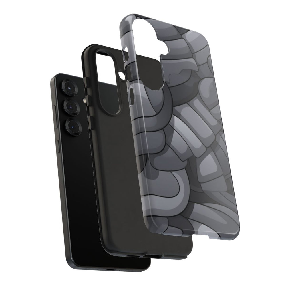 Dit hoesje is voorzien van een abstract patroon met verweven buisvormen in verschillende grijstinten. De vormen hebben gladde, afgeronde randen en een gestileerde, bijna cartoonachtige uitstraling met subtiele schaduweffecten voor extra diepte. Het ontwerp is minimalistisch en monochroom, waarbij textuur en vorm centraal staan zonder extra kleuren of details. Het glanzende, stevige hoesje heeft een dubbele laag voor extra bescherming en ondersteunt draadloos opladen.