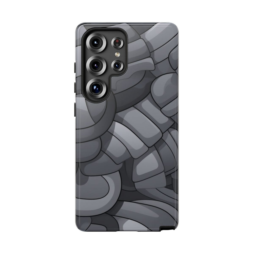 Dit hoesje is voorzien van een abstract patroon met verweven buisvormen in verschillende grijstinten. De vormen hebben gladde, afgeronde randen en een gestileerde, bijna cartoonachtige uitstraling met subtiele schaduweffecten voor extra diepte. Het ontwerp is minimalistisch en monochroom, waarbij textuur en vorm centraal staan zonder extra kleuren of details. Het glanzende, stevige hoesje heeft een dubbele laag voor extra bescherming en ondersteunt draadloos opladen.