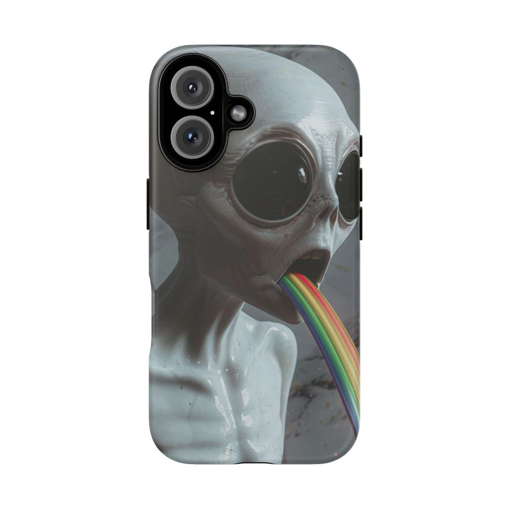 Dit hoesje heeft een realistisch vormgegeven grijze alien met een gladde, glanzende huid en grote zwarte ogen. De alien buigt zijn hoofd en opent zijn mond, waaruit een levendige regenboogstraal komt. De achtergrond heeft een subtiele, vintage filmstructuur met een lichte VHS-korrel, wat zorgt voor een zachte, filmische verlichting. Het hoesje is gemaakt van 100% polycarbonaat en 100% TPU, waardoor het stevig is en optimale bescherming biedt. Ondersteunt draadloos opladen.