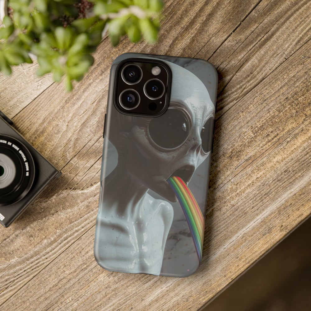 Dit telefoonhoesje heeft een gestileerde grijze alien met een gladde, spiegelende huid en grote zwarte ogen. Het hoofd van de alien is gebogen en uit de open mond straalt een levendige regenboog. De achtergrond is voorzien van een subtiele vintage filmtextuur, wat de surrealistische sfeer versterkt. Het hoesje biedt uitstekende bescherming en duurzaamheid dankzij de dubbele laag van polycarbonaat en TPU. Ondersteunt draadloos opladen. Ideaal voor liefhebbers van opvallende en fantasierijke ontwerpen.