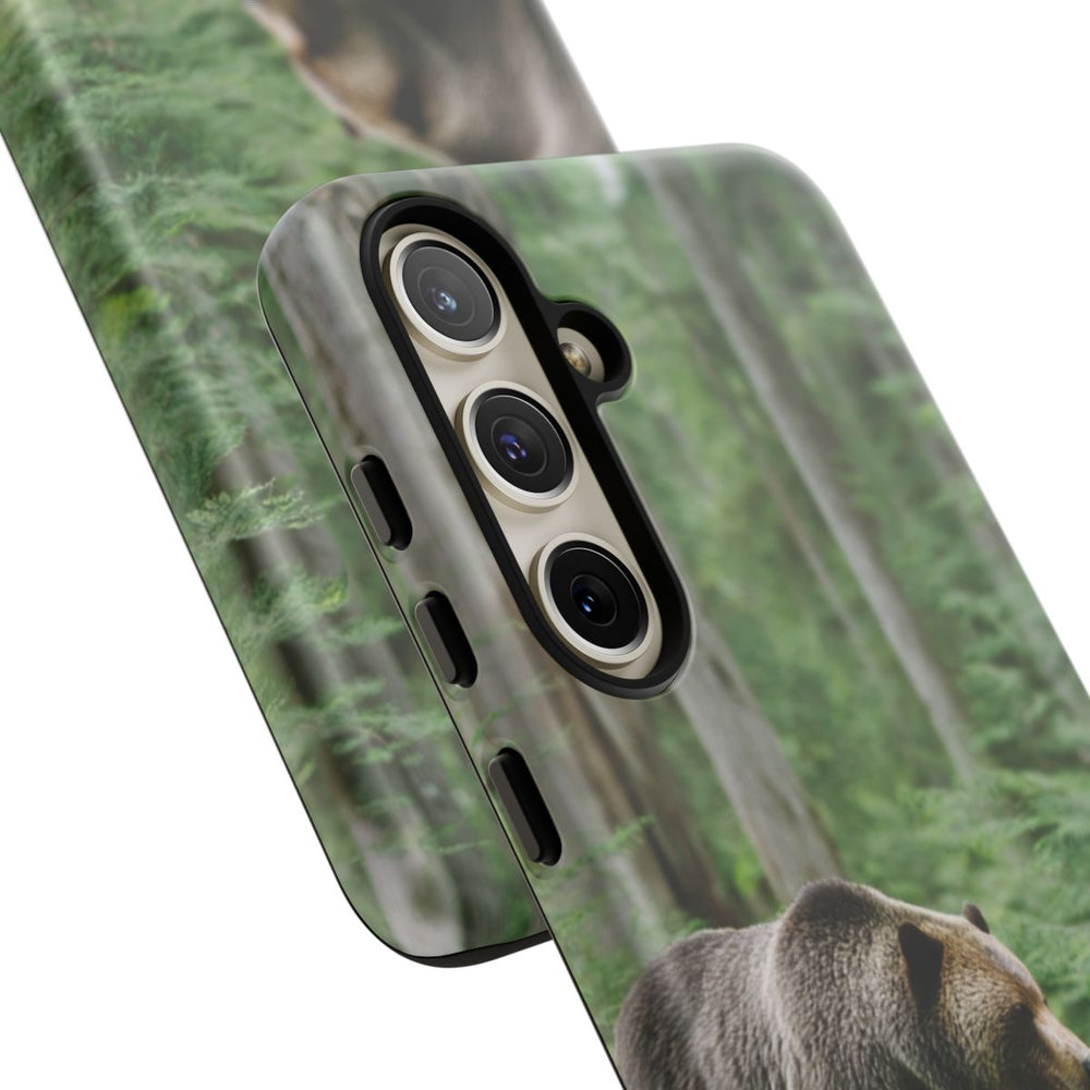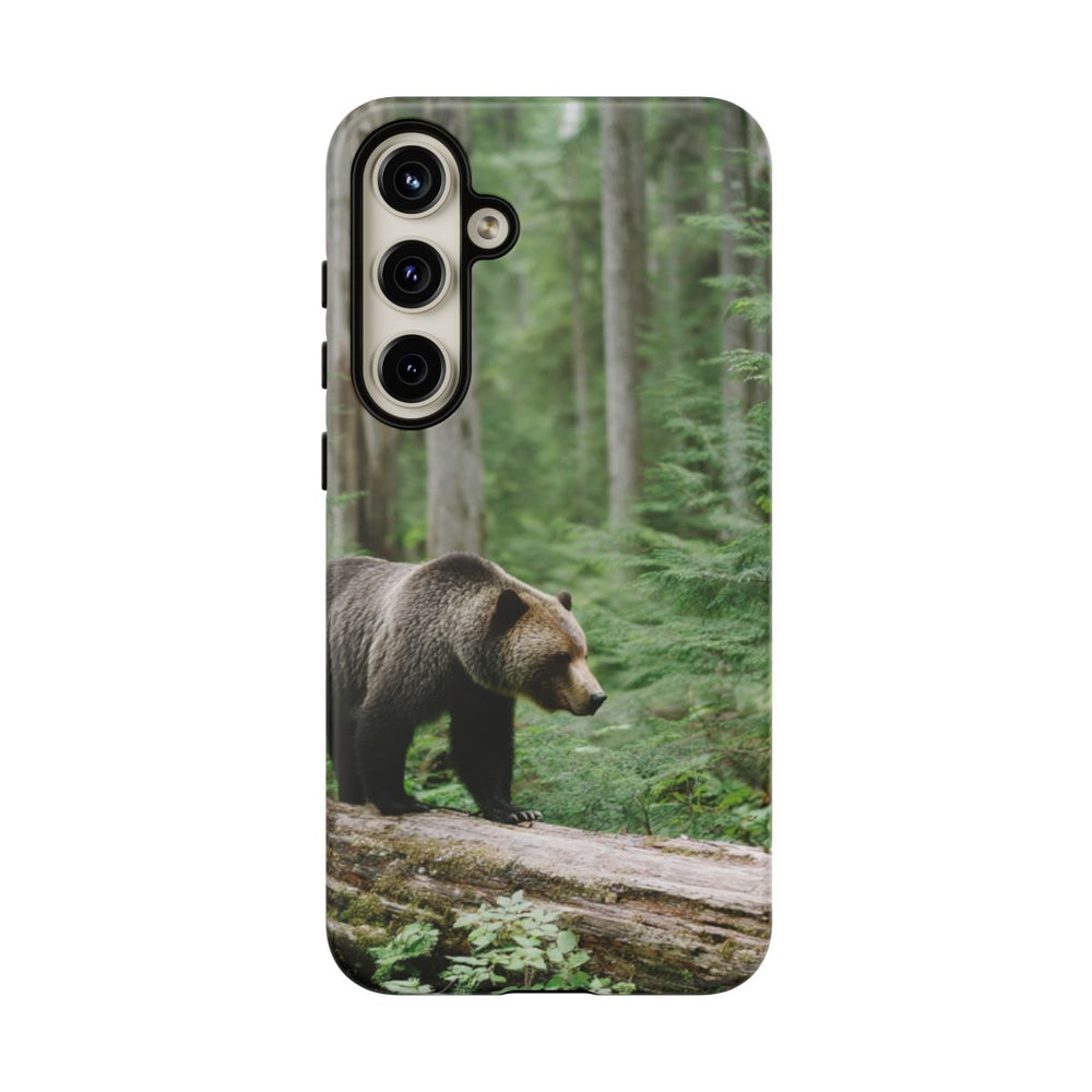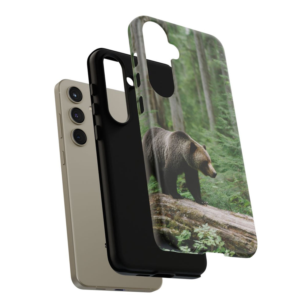 Dit hoesje toont een grizzlybeer die van rechts naar links over een grote omgevallen boomstam loopt in een dichtbegroeid bos. Op de achtergrond zijn hoge ceders en weelderig groene bladeren te zien, wat zorgt voor een natuurlijke bosrijke sfeer. Het hoesje heeft een dubbele laag met een matte afwerking: een stevige polycarbonaat buitenkant en een TPU-binnenzijde voor extra stevigheid en bescherming. Ondersteunt draadloos opladen, maar is niet geschikt voor MagSafe.