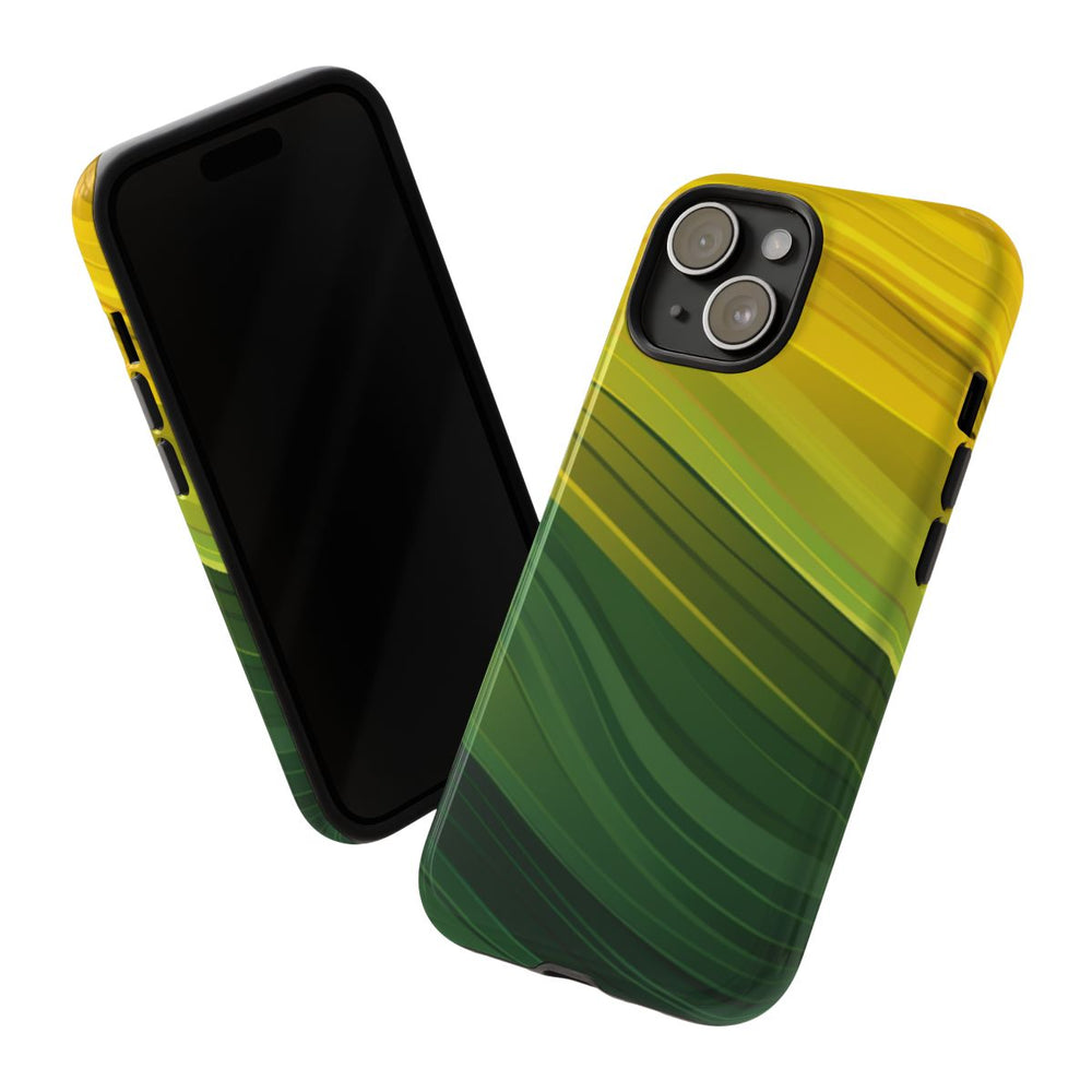 Dit telefoonhoesje heeft een vloeiend golvenpatroon in tinten groen en geel. De golven zorgen voor een soepel, golvend effect met gelaagde lijnen die variëren van felgeel tot diepgroen. Het abstracte en dynamische ontwerp geeft een gevoel van beweging en diepte. Het hoesje heeft een glanzende afwerking en bestaat uit twee lagen van polycarbonaat en TPU voor extra stevigheid en bescherming. Geschikt voor draadloos opladen en bestand tegen weersinvloeden.