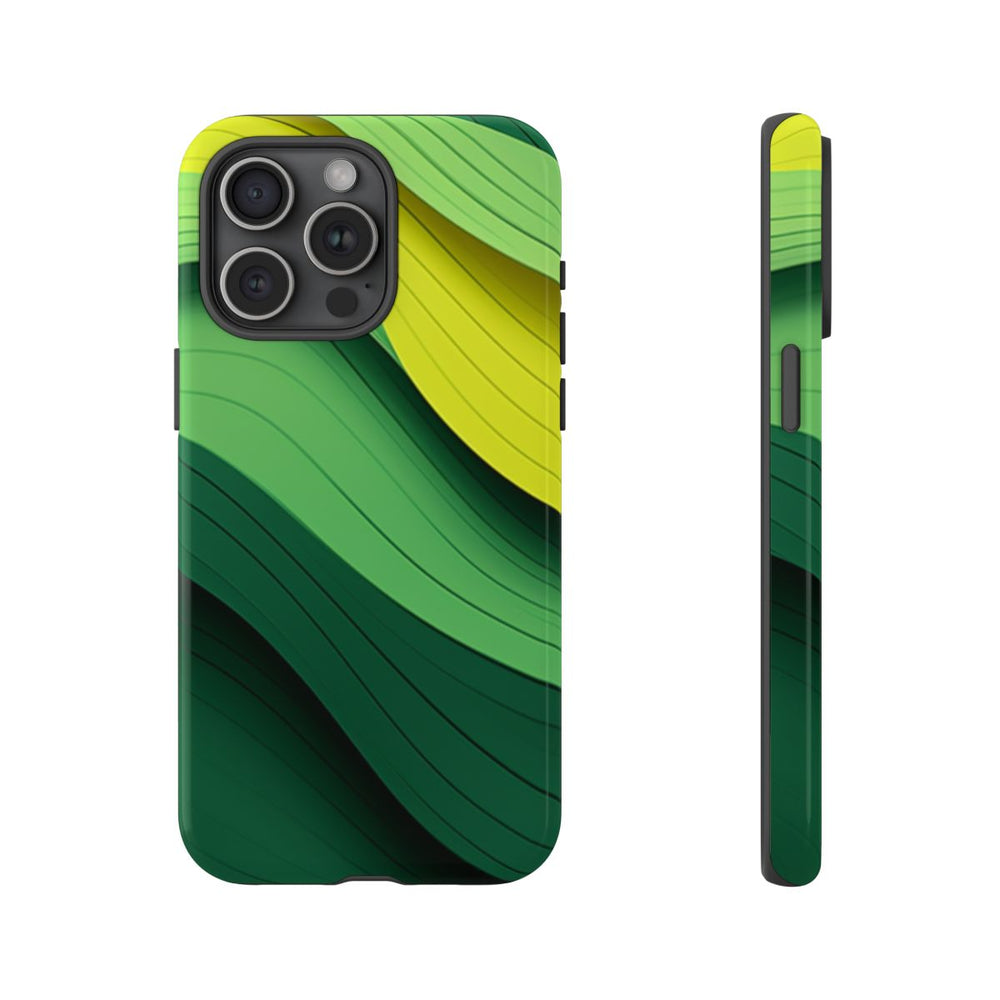Dit hoesje heeft een stijlvol golvenpatroon in diverse tinten groen en geel. De golven lopen vloeiend in elkaar over en worden geaccentueerd door fijne lijnen, wat zorgt voor een gelaagd en dynamisch effect. De kleuren veranderen geleidelijk van helder geel naar diep groen, wat het hoesje een levendige uitstraling geeft. Het hoesje is voorzien van een glanzende, stevige buitenkant van polycarbonaat en een TPU-binnenzijde voor extra bescherming en duurzaamheid. Geschikt voor draadloos opladen en bestand tegen weersinvloeden, terwijl de helderheid behouden blijft.