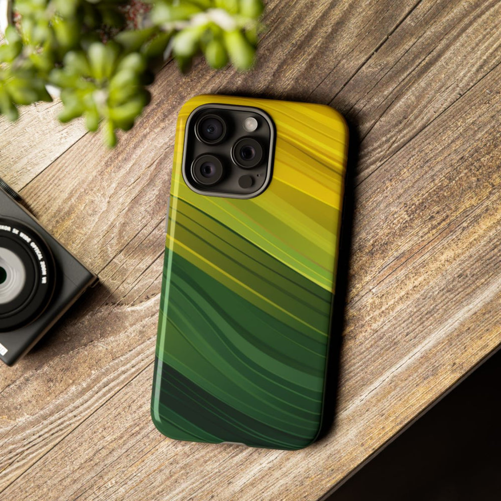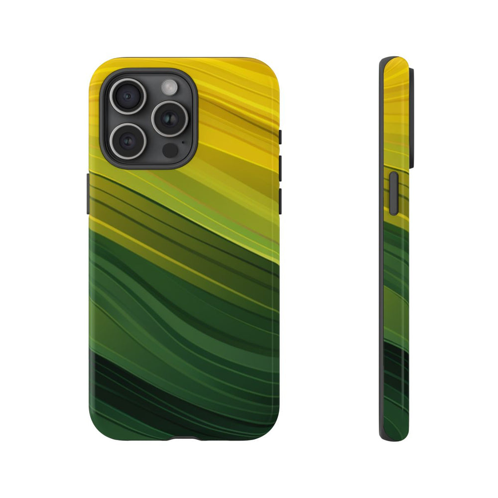 Dit telefoonhoesje heeft een vloeiend golvenpatroon in tinten groen en geel. De golven zorgen voor een soepel, golvend effect met gelaagde lijnen die variëren van felgeel tot diepgroen. Het abstracte en dynamische ontwerp geeft een gevoel van beweging en diepte. Het hoesje heeft een glanzende afwerking en bestaat uit twee lagen van polycarbonaat en TPU voor extra stevigheid en bescherming. Geschikt voor draadloos opladen en bestand tegen weersinvloeden.