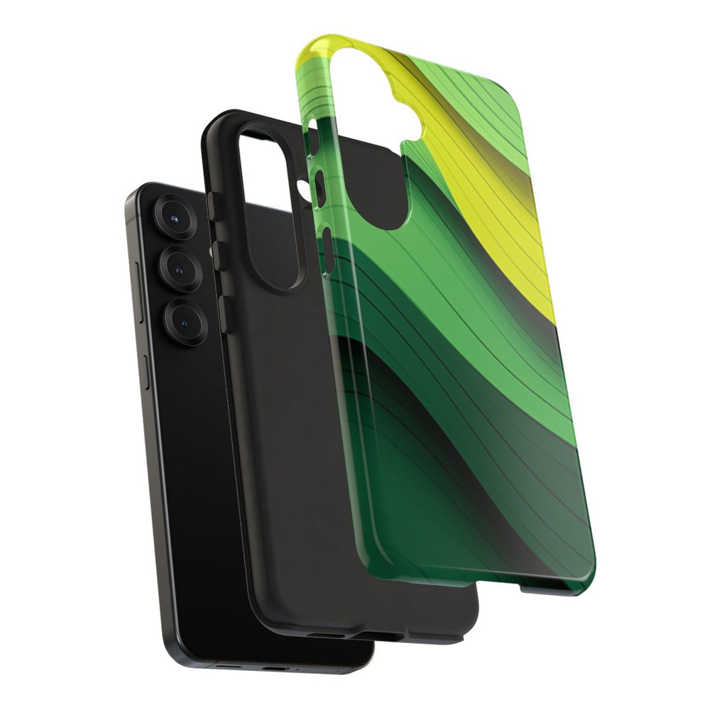 Dit hoesje heeft een stijlvol golvenpatroon in diverse tinten groen en geel. De golven lopen vloeiend in elkaar over en worden geaccentueerd door fijne lijnen, wat zorgt voor een gelaagd en dynamisch effect. De kleuren veranderen geleidelijk van helder geel naar diep groen, wat het hoesje een levendige uitstraling geeft. Het hoesje is voorzien van een glanzende, stevige buitenkant van polycarbonaat en een TPU-binnenzijde voor extra bescherming en duurzaamheid. Geschikt voor draadloos opladen en bestand tegen weersinvloeden, terwijl de helderheid behouden blijft.