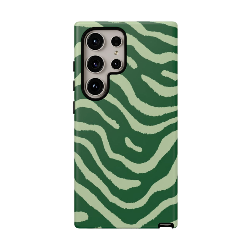 Dit hoesje heeft een opvallend patroon van golvende, onregelmatige strepen in twee groentinten. De lichte groene strepen lopen organisch over een donkergroene achtergrond, wat zorgt voor een dynamische en grafische uitstraling. Het ontwerp is minimalistisch maar toch in het oog springend, met een natuurlijke, vloeiende uitstraling die doet denken aan abstracte tijgerstrepen of watergolven. Het hoesje bestaat uit twee stevige lagen van polycarbonaat en TPU en biedt extra bescherming en duurzaamheid. Geschikt voor draadloos opladen.