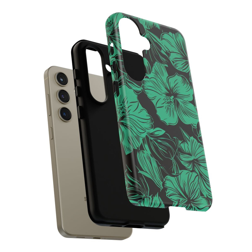 Dit hoesje is voorzien van een herhalend patroon van groene tropische bloemen en bladeren op een zwarte achtergrond. De bloemen zijn geïllustreerd met penseelstreken en fijne lijnen, wat zorgt voor een levendige en elegante uitstraling. Het patroon bedekt de volledige oppervlakte, waardoor het hoesje opvalt en stijlvol oogt. Dankzij de dubbele laag, bestaande uit een polycarbonaat buitenkant en een TPU-binnenlaag, biedt het hoesje extra bescherming en duurzaamheid. Geschikt voor draadloos opladen. Niet geschikt voor MagSafe.