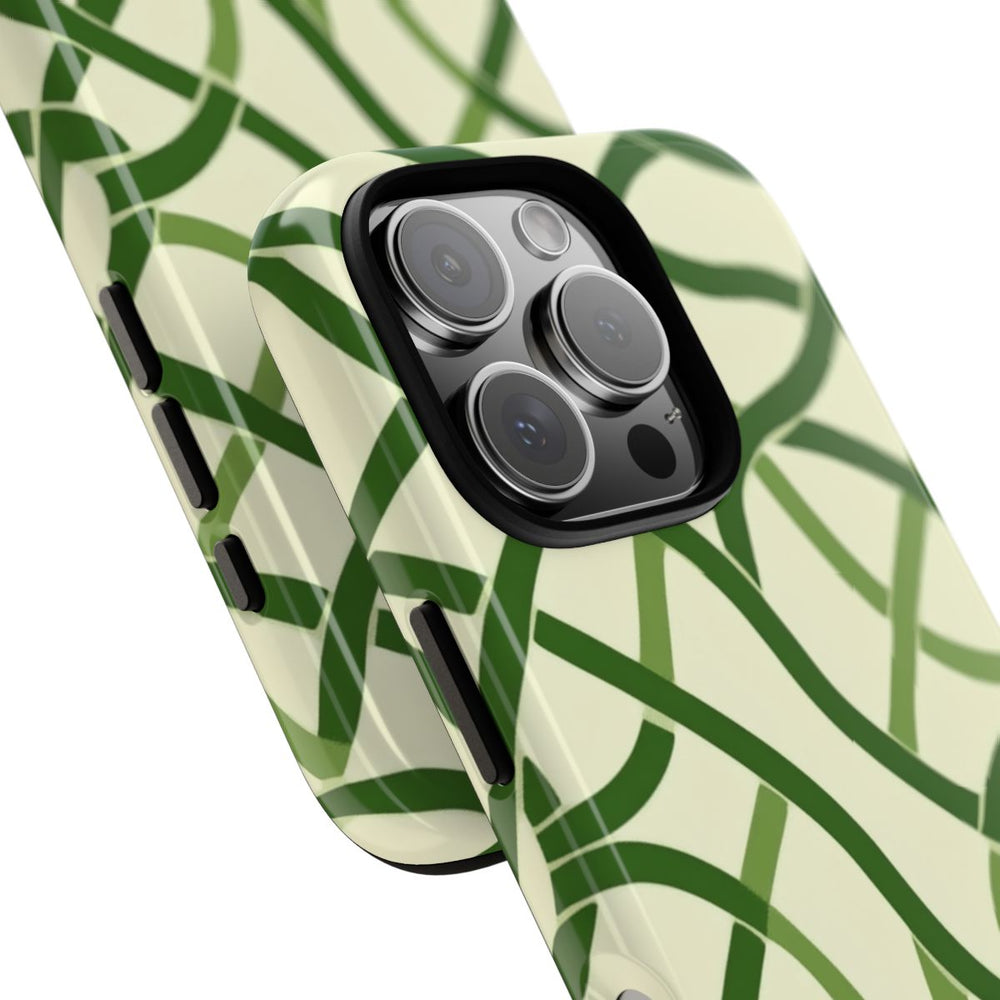 Dit telefoonhoesje heeft een naadloos Keltisch knoopmotief met in elkaar verweven groene linten op een lichte crèmekleurige achtergrond. De vloeiende lijnen vormen een doorlopend, geweven effect. Het minimalistische en klassieke ontwerp benadrukt de elegante rondingen en lussen in verschillende groentinten. De print is aangebracht op een glanzend en stevig hoesje van duurzaam polycarbonaat met een TPU-binnenzijde, wat zorgt voor dubbele bescherming en ondersteuning voor draadloos opladen.