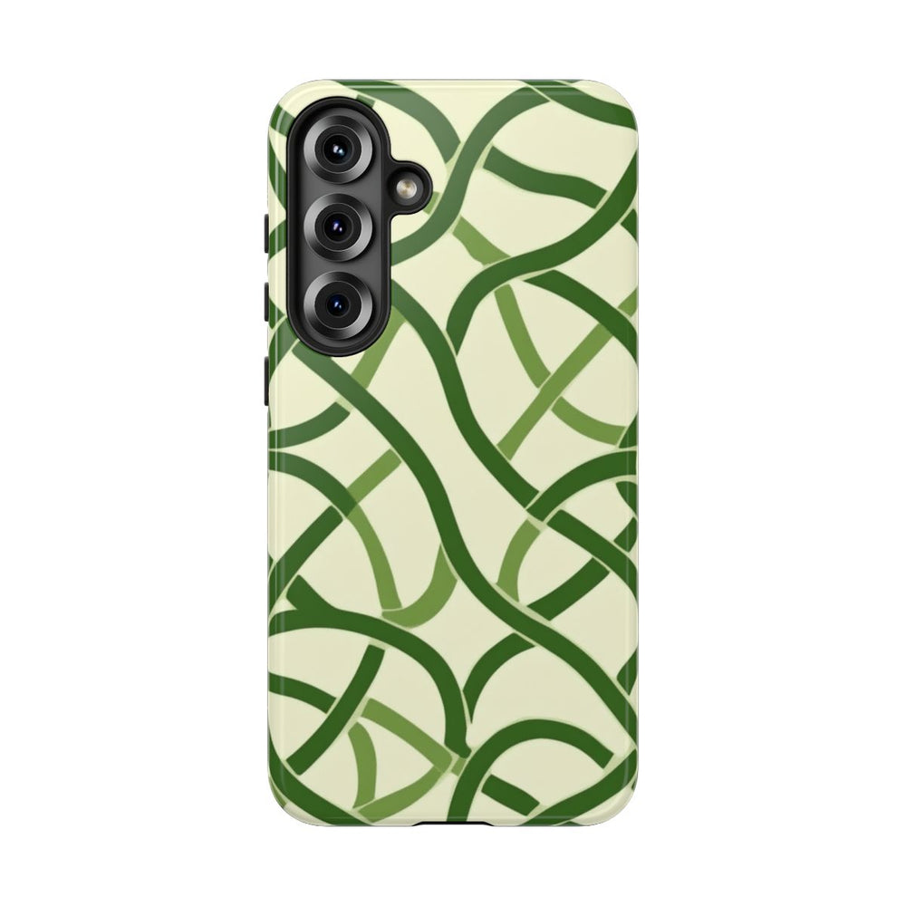Dit telefoonhoesje heeft een naadloos Keltisch knoopmotief met in elkaar verweven groene linten op een lichte crèmekleurige achtergrond. De vloeiende lijnen vormen een doorlopend, geweven effect. Het minimalistische en klassieke ontwerp benadrukt de elegante rondingen en lussen in verschillende groentinten. De print is aangebracht op een glanzend en stevig hoesje van duurzaam polycarbonaat met een TPU-binnenzijde, wat zorgt voor dubbele bescherming en ondersteuning voor draadloos opladen.
