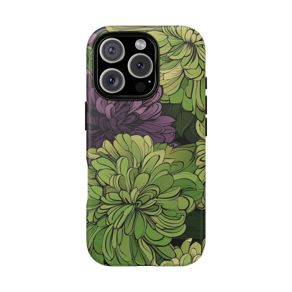 Dit hoesje is bedrukt met een gedetailleerd patroon van chrysanten in groene en paarse tinten. De bloemen staan dicht op elkaar, met duidelijk zichtbare bloemblaadjes en bladeren die zorgen voor een rijke, levendige uitstraling. Fijne zwarte lijnen omlijnen het patroon en benadrukken de bloemdetails. Het matte hoesje is gemaakt van polycarbonaat en TPU en biedt een dubbele beschermlaag. Daarnaast is het hoesje geschikt voor draadloos opladen. De stijl is fris, kleurrijk en botanisch.