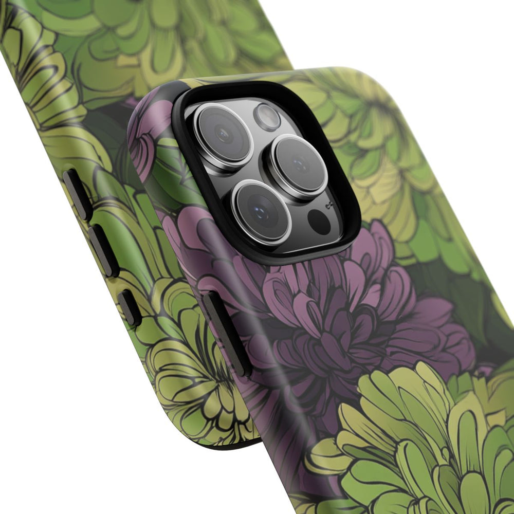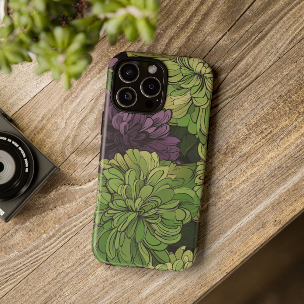 Dit hoesje is bedrukt met een gedetailleerd patroon van chrysanten in groene en paarse tinten. De bloemen staan dicht op elkaar, met duidelijk zichtbare bloemblaadjes en bladeren die zorgen voor een rijke, levendige uitstraling. Fijne zwarte lijnen omlijnen het patroon en benadrukken de bloemdetails. Het matte hoesje is gemaakt van polycarbonaat en TPU en biedt een dubbele beschermlaag. Daarnaast is het hoesje geschikt voor draadloos opladen. De stijl is fris, kleurrijk en botanisch.