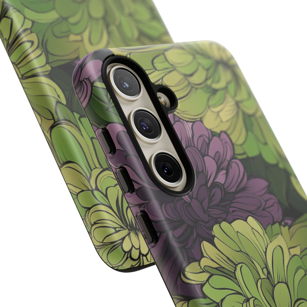 Dit hoesje is bedrukt met een gedetailleerd patroon van chrysanten in groene en paarse tinten. De bloemen staan dicht op elkaar, met duidelijk zichtbare bloemblaadjes en bladeren die zorgen voor een rijke, levendige uitstraling. Fijne zwarte lijnen omlijnen het patroon en benadrukken de bloemdetails. Het matte hoesje is gemaakt van polycarbonaat en TPU en biedt een dubbele beschermlaag. Daarnaast is het hoesje geschikt voor draadloos opladen. De stijl is fris, kleurrijk en botanisch.