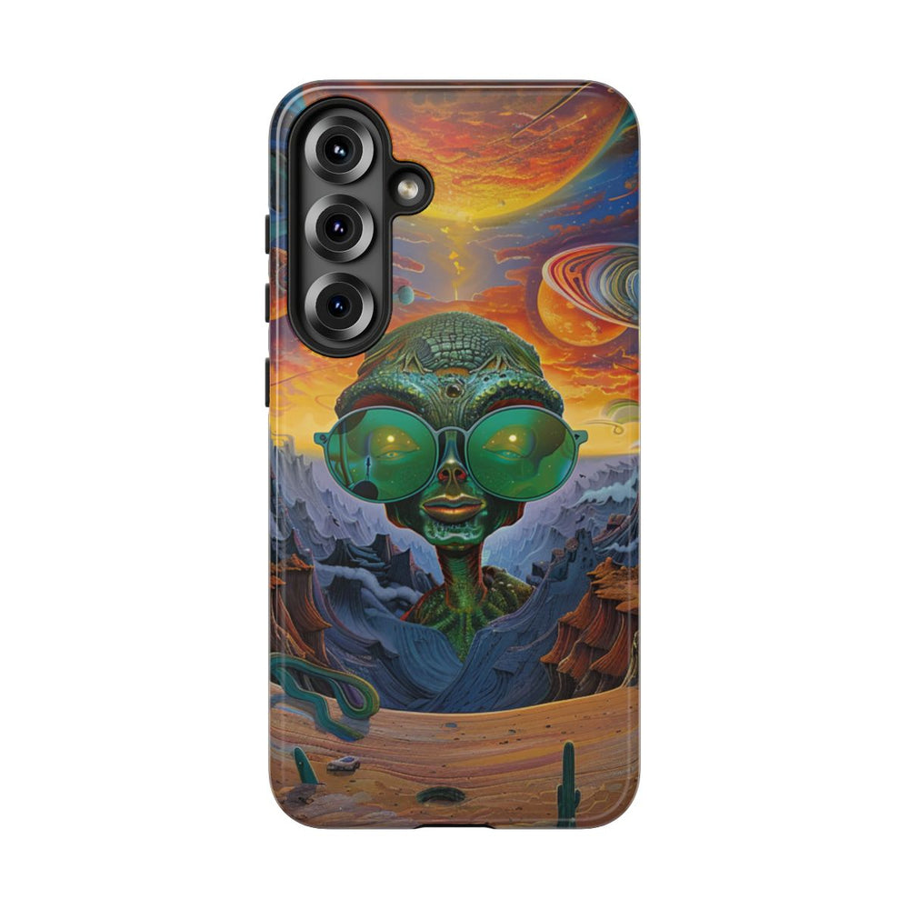 Dit telefoonhoesje heeft een opvallend ontwerp met een grote groene alienkop die een oversized groene zonnebril draagt. De achtergrond toont een surrealistisch, kleurrijk buitenaards landschap met rotsachtige ondergrond, kronkelende paden en hoge formaties onder een levendige hemel vol draaiende kosmische elementen, planeten en sterren. Het geheel combineert fantasie en ruimte in een psychedelische, dromerige stijl. Het hoesje bestaat uit twee lagen van polycarbonaat en TPU, wat zorgt voor extra bescherming en ondersteuning van draadloos opladen.