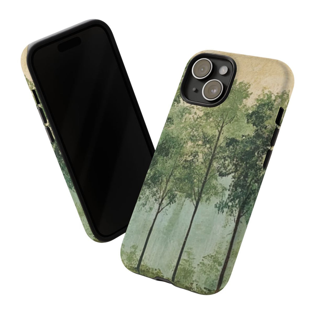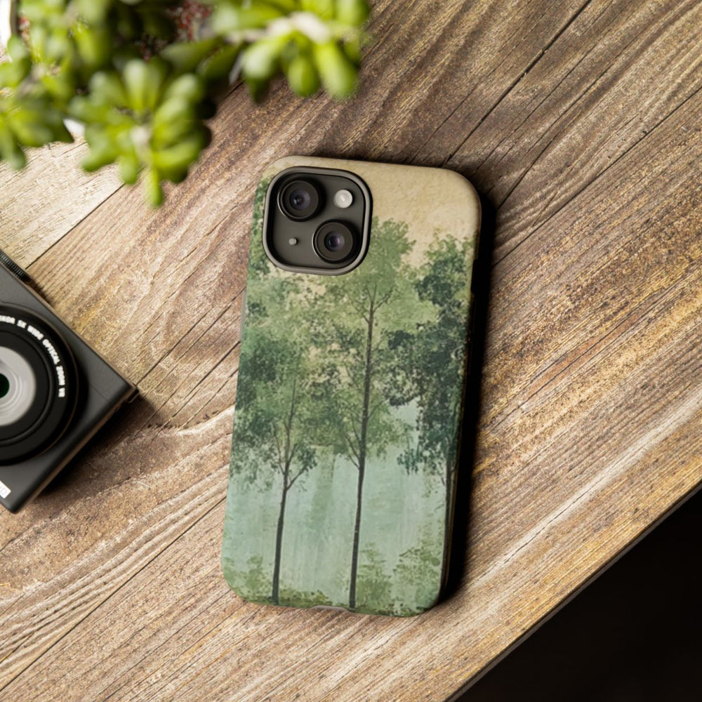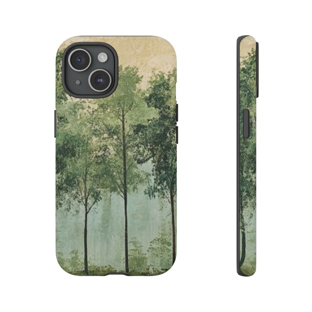 Dit hoesje is voorzien van een kunstzinnige afbeelding van een bosrand met verschillende tinten groene bladeren en slanke boomstammen. De achtergrond heeft een geschilderde, licht getextureerde uitstraling in zachte beige- en groentinten, wat zorgt voor een rustige en natuurlijke sfeer. De afbeelding is gedrukt op een mat hoesje van polycarbonaat en TPU, dat bestaat uit twee lagen en geschikt is voor draadloos opladen. Het geheel straalt sereniteit en inspiratie uit de natuur uit.