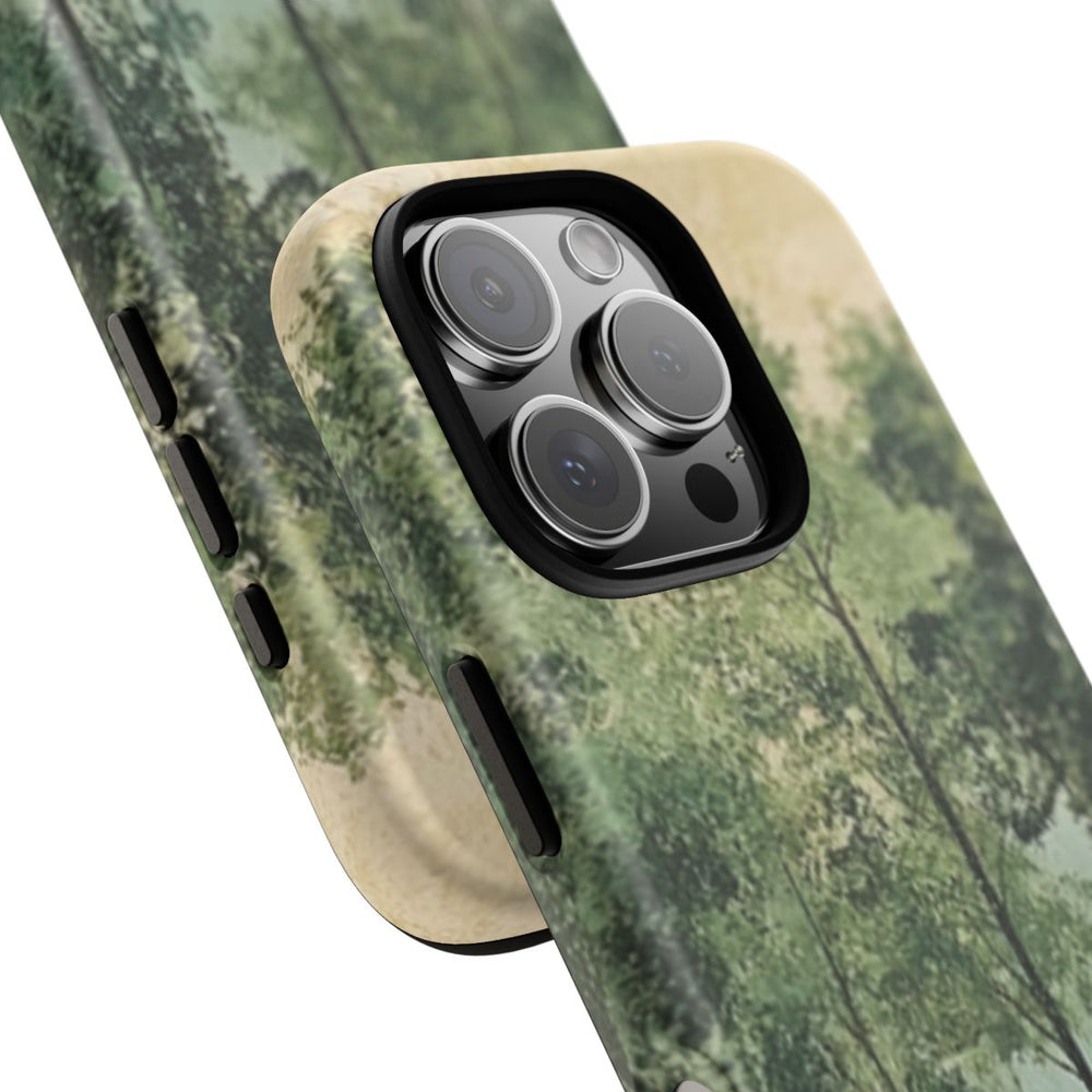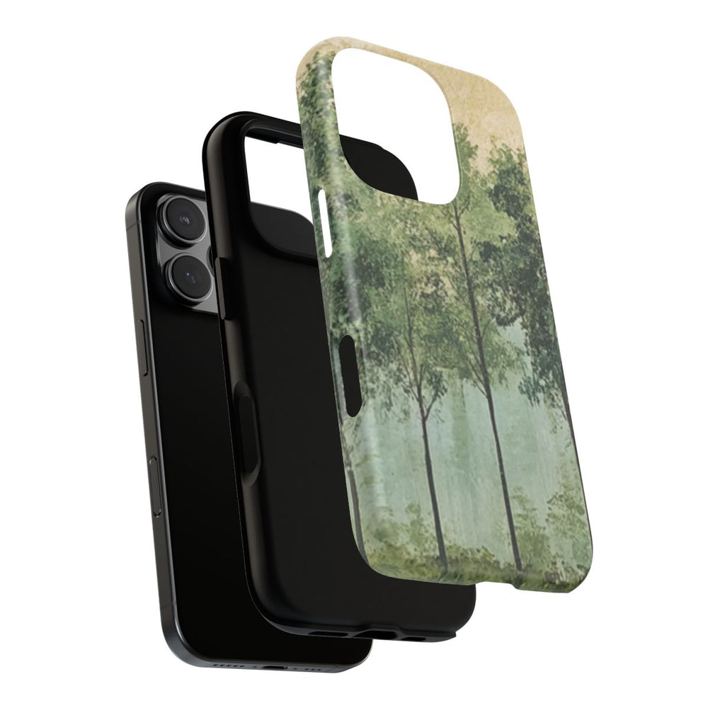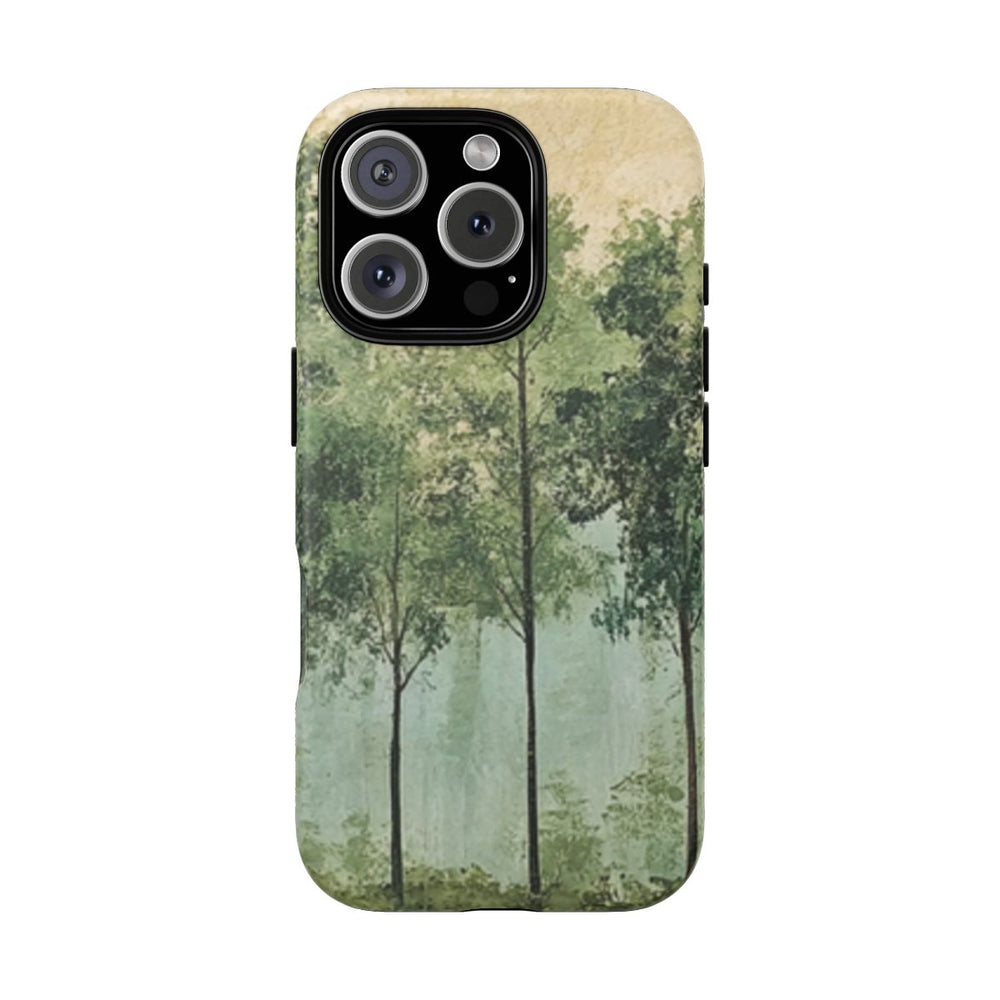 Dit hoesje is voorzien van een kunstzinnige afbeelding van een bosrand met verschillende tinten groene bladeren en slanke boomstammen. De achtergrond heeft een geschilderde, licht getextureerde uitstraling in zachte beige- en groentinten, wat zorgt voor een rustige en natuurlijke sfeer. De afbeelding is gedrukt op een mat hoesje van polycarbonaat en TPU, dat bestaat uit twee lagen en geschikt is voor draadloos opladen. Het geheel straalt sereniteit en inspiratie uit de natuur uit.