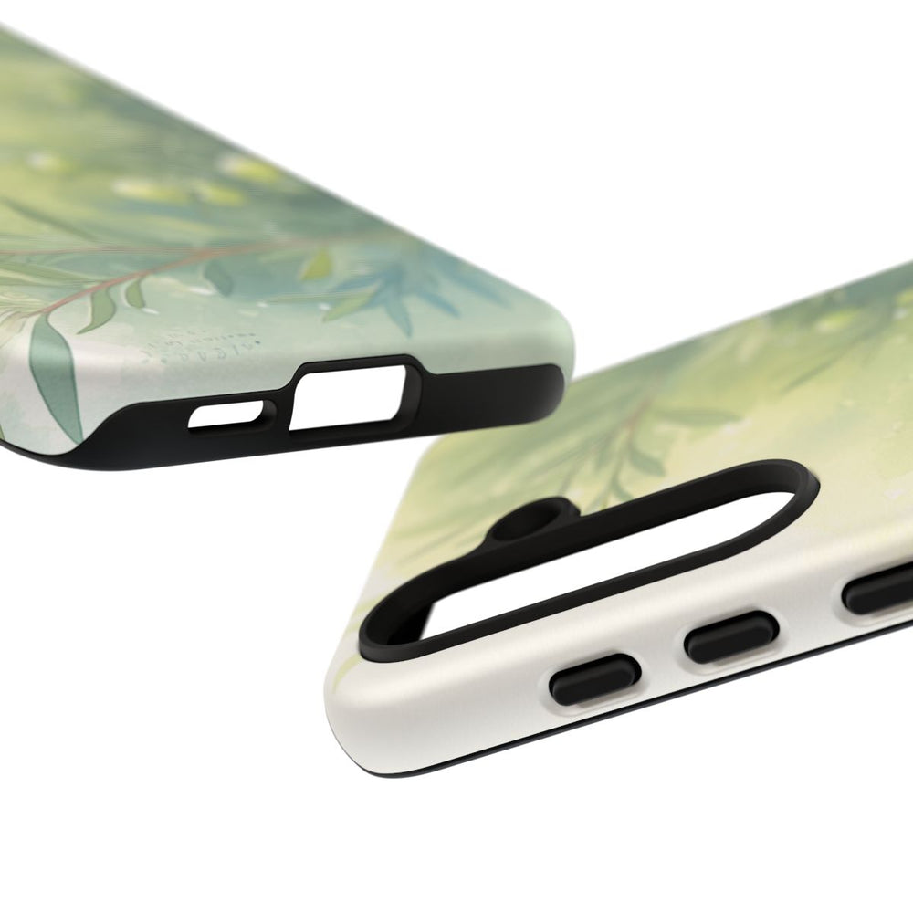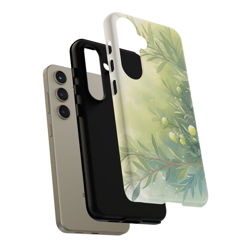 Dit ontwerp toont een gedetailleerde botanische illustratie van groene bladeren en kleine ronde bloemen. De aquarelstijl zorgt voor zachte groene en blauwe tinten die subtiel overlopen in een lichte achtergrond. Fijne lijntjes accentueren de natuurlijke vormen van de plant en geven het hoesje een rustige, bosrijke uitstraling. De afbeelding is gedrukt op een mat telefoonhoesje van polycarbonaat en TPU, met dubbele beschermlaag en ondersteuning voor draadloos opladen.