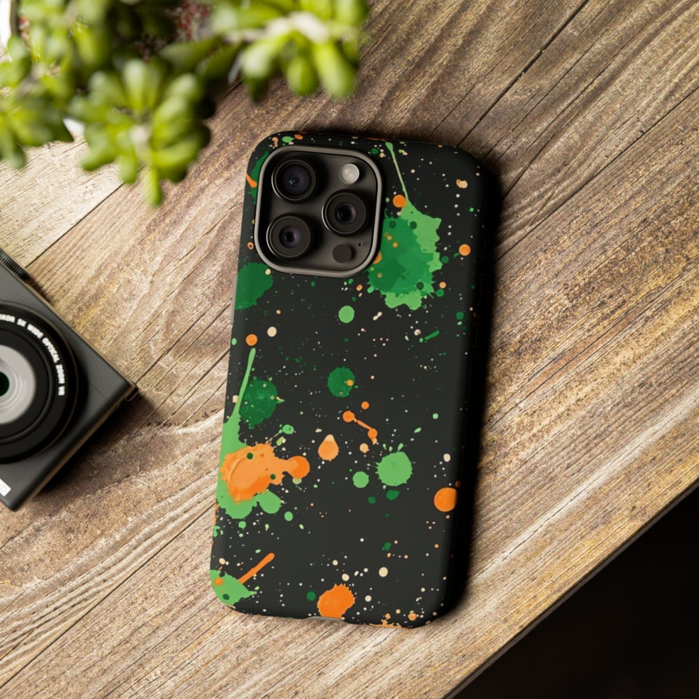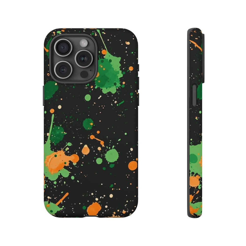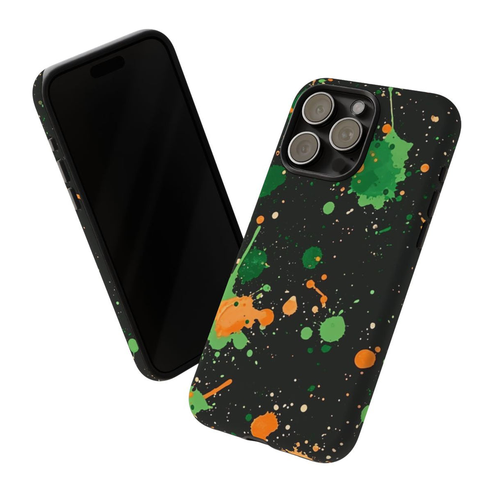 Dit telefoonhoesje is voorzien van een levendig patroon van groene en oranje verfspatten op een diepzwarte achtergrond. De spatten verschillen in grootte en vorm, wat zorgt voor een energieke en abstracte uitstraling. Het hoesje bestaat uit twee lagen: een stevige buitenkant van polycarbonaat en een flexibele binnenkant van TPU voor extra bescherming en duurzaamheid. Het hoesje ondersteunt draadloos opladen en is bestand tegen invloeden van buitenaf, zodat de uitstraling langdurig behouden blijft.