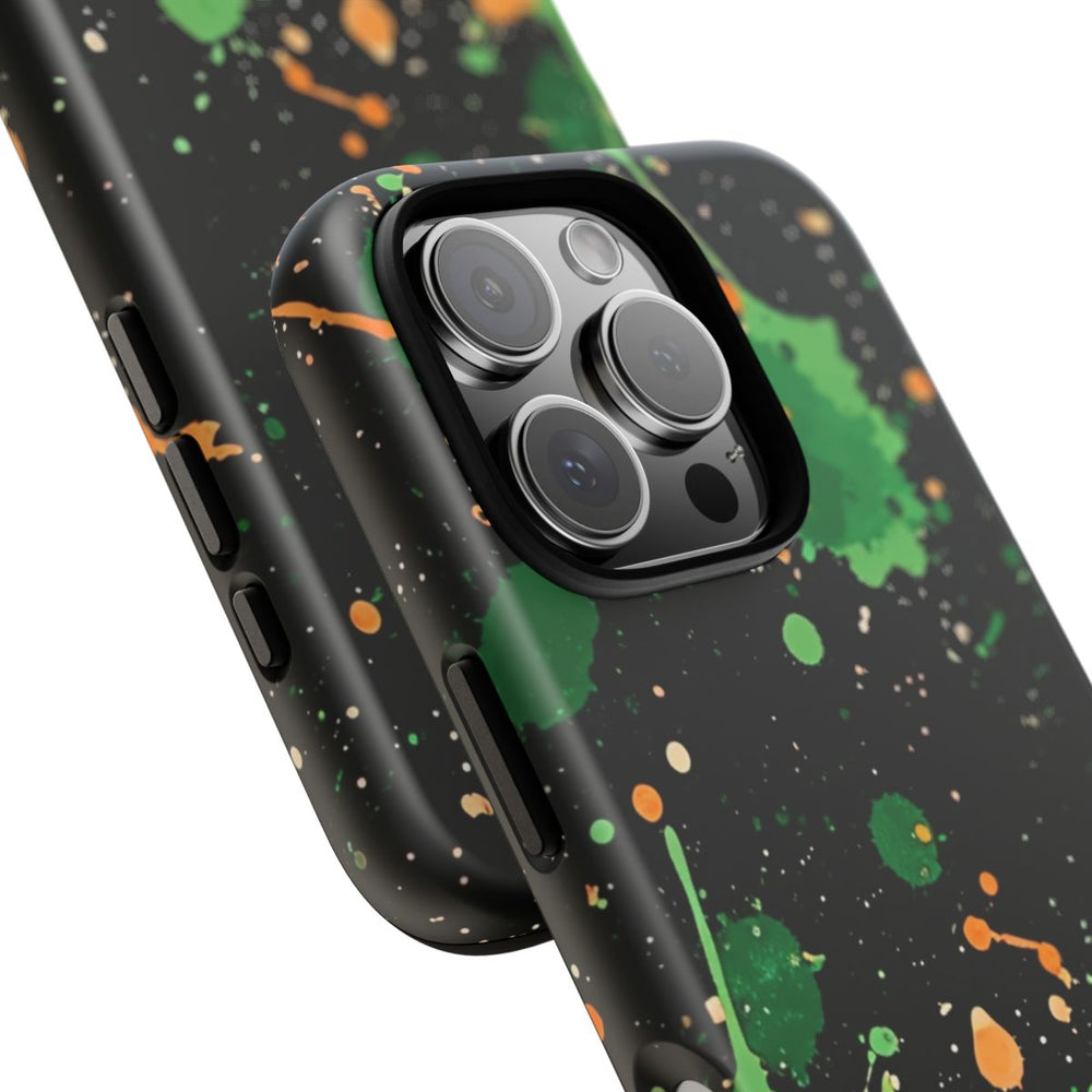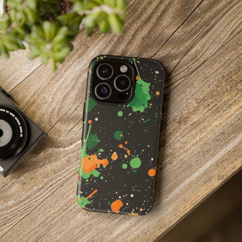 Dit telefoonhoesje is voorzien van een levendig patroon van groene en oranje verfspatten op een diepzwarte achtergrond. De spatten verschillen in grootte en vorm, wat zorgt voor een energieke en abstracte uitstraling. Het hoesje bestaat uit twee lagen: een stevige buitenkant van polycarbonaat en een flexibele binnenkant van TPU voor extra bescherming en duurzaamheid. Het hoesje ondersteunt draadloos opladen en is bestand tegen invloeden van buitenaf, zodat de uitstraling langdurig behouden blijft.